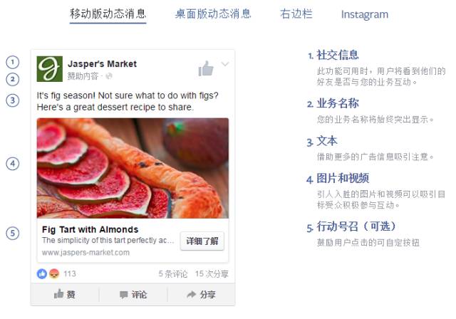 一则植入 News Feed 中的社交广告,可以包含五大信息,分别是社交信息(如谁赞过)、业务名称(广告主品牌)、文本、图片和视频,以及行动号召(例如鼓励用户了解、安装、体现等语言或者自定义按钮)。这些要素对于广告主来说,无疑比以往的展示广告要更具影响力。