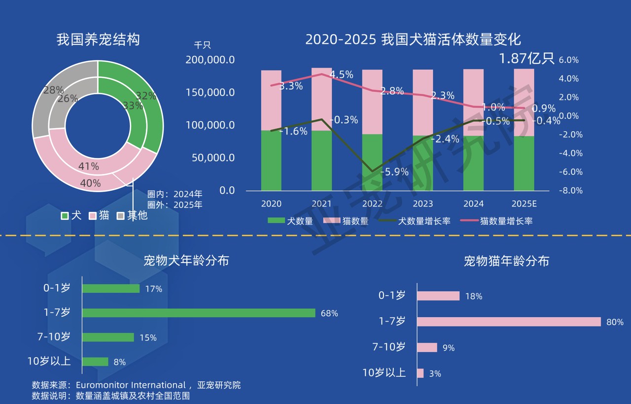 整体上,2024-2025 年,我国宠物市场规模稳健增长。对比 2024 年,我国养宠结构变化不大,犬猫仍占 7 成。从宠物年龄分布来看,老龄化趋势放缓,老龄化宠物市场处于起步阶段,未来有较大增长空间。