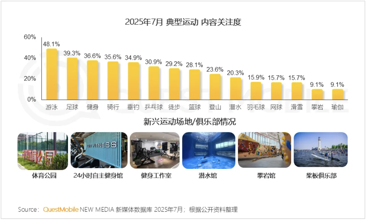 报告显示,在全民运动热潮下,2025 年 7 月全网运动健身相关内容互动量达 1.66 亿次,全网典型运动内容关注度 Top 5 的运动分别为游泳、足球、健身、骑行、垂钓。运动市场呈现双轨并行动态格局,游泳、足球、健身等大众项目构筑市场根基,潜水、攀岩等新兴业态进一步推进市场结构跃迁。