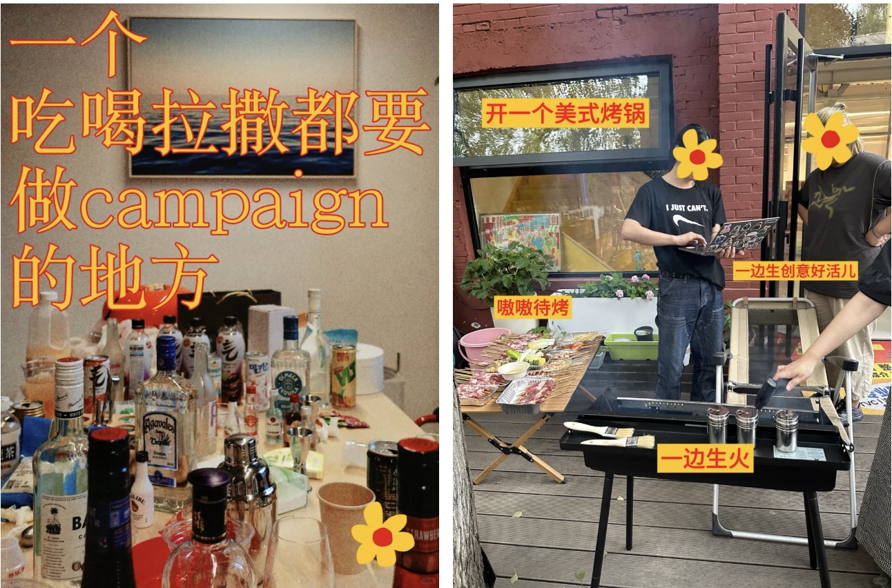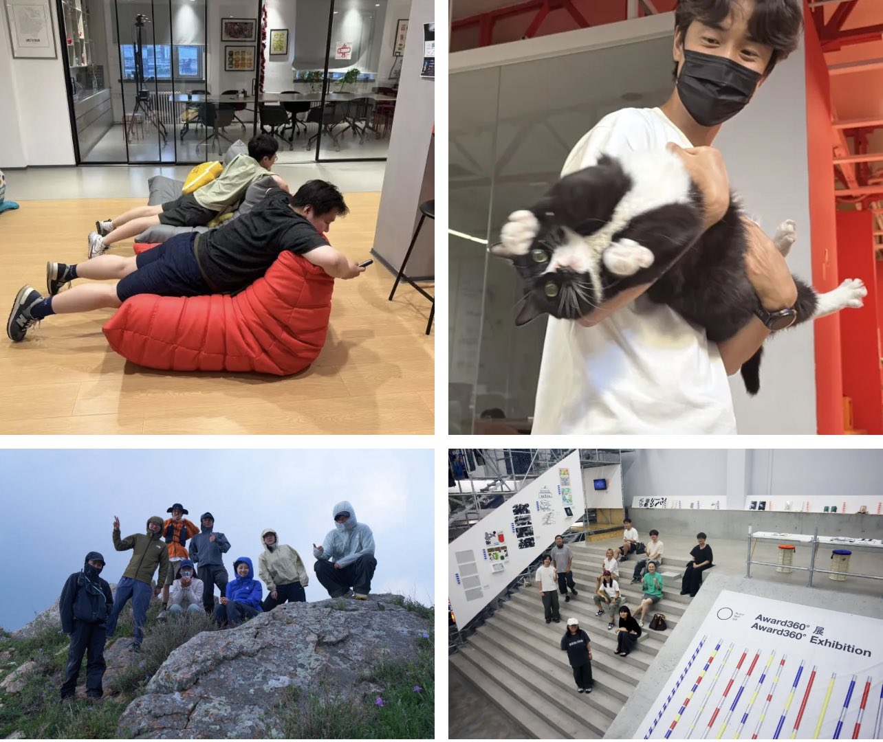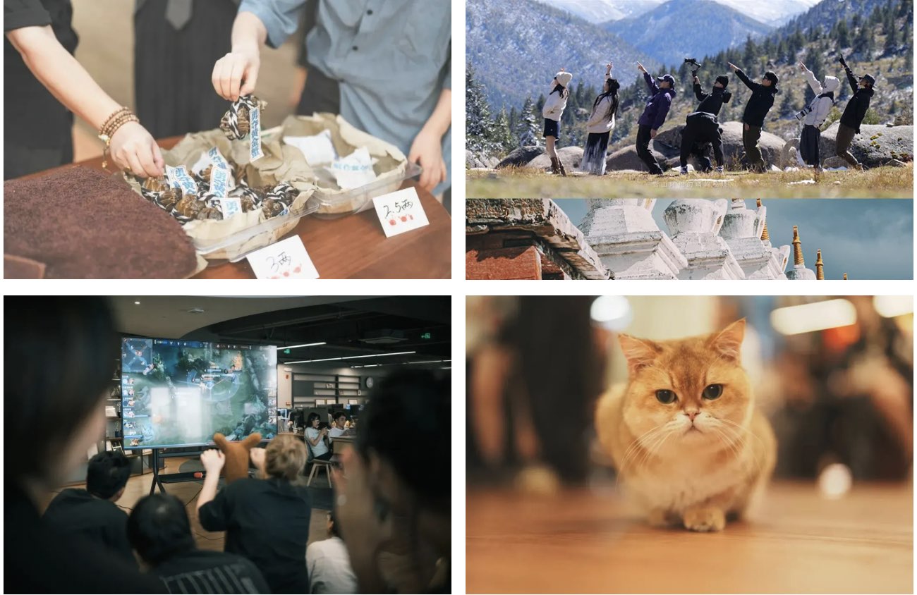 在蓝昊,除了打磨「BU 将就」好创意之外,也有着各种「BU 正经」的玩法,去发散更多天马行空的创意。所以,蓝昊一直保留着「一年一旅游,一月一活动」的「放风」频率,在「怎么玩好」这件事情上孜孜不倦。比如,城里找不到灵感了,那就公费去外面野一下吧:平时上班虽然没有鱼可以摸,但猫还是可以自助撸的:还有,只要大小是个节,就一定少不了热热闹闹吃一顿,玩一通……