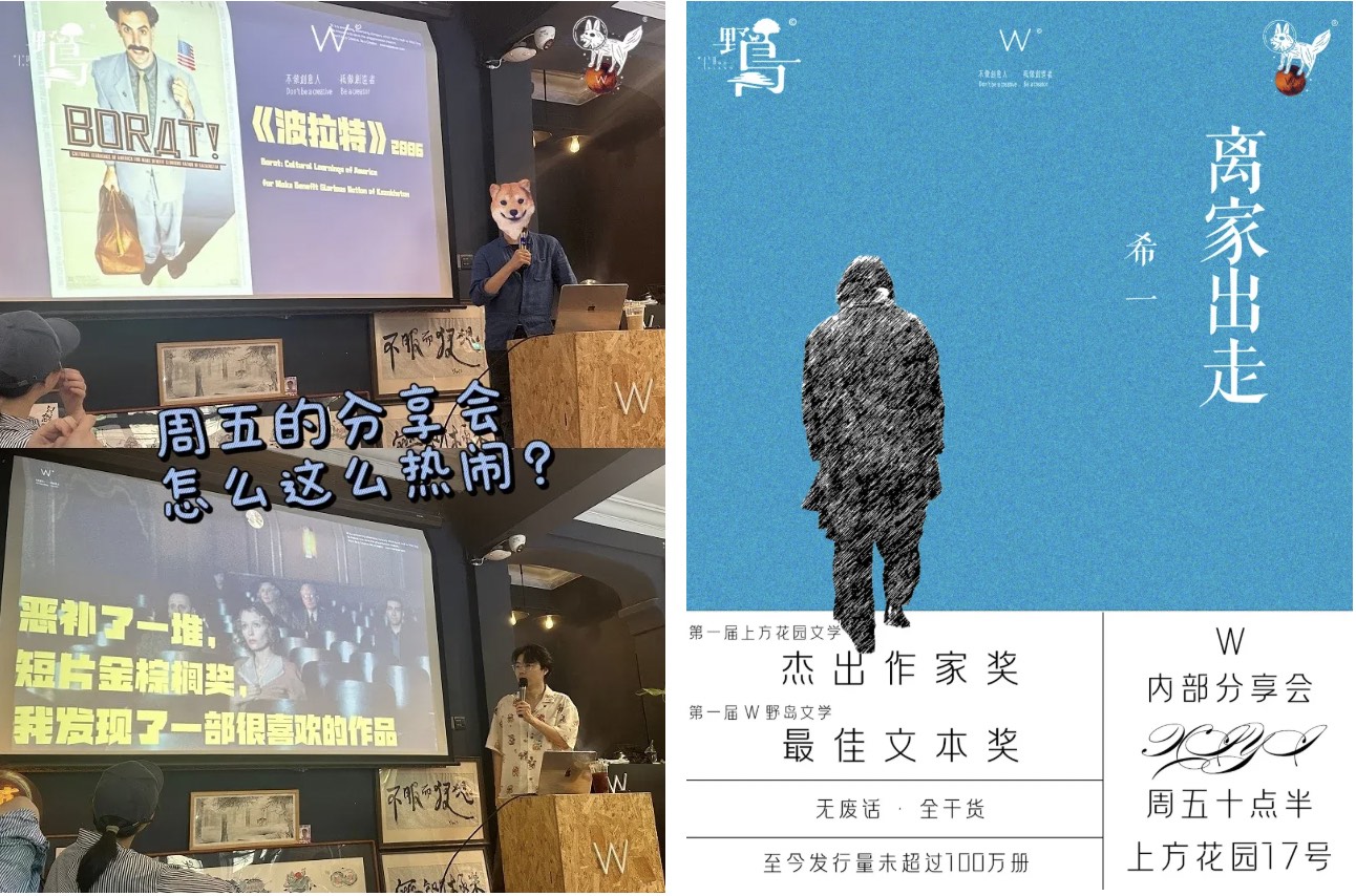W 坚守「不做创意人,只做创造者」,他们自己办电台、发专辑、出周边、画漫画、艺术展。和创意有关有趣的事情,你都可以在这里尝试,为年轻创意人们提供一个充分展示的创意舞台。此外,在 W 也会定期举办内部分享会,干货满满,也让大家有一个充分展示自己的机会。