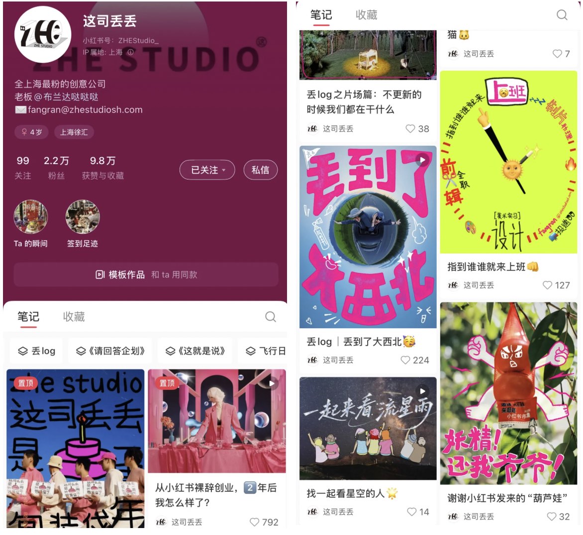 这司丢丢是一家年轻广告创意公司,曾在小红书发布《创业|从小红书裸辞后,我决定创业》讲述从自由职业者转变成小小工作室的心路历程,日常也会分享各种有趣的内容,作品幕后、街头采访、以及团队玩耍日常「丢log」。