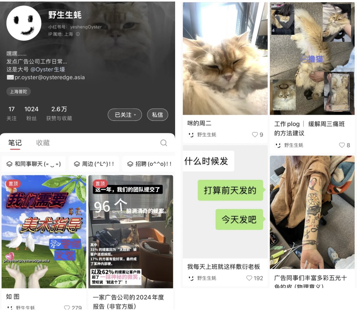 Oyster 在小红书上除了有分享案例的正经大号@Oyster生壕,他们还有专门发点广告公司工作日常的@野生生蚝,快去他们的小红书上围观广告公司有趣日常和精神状态。