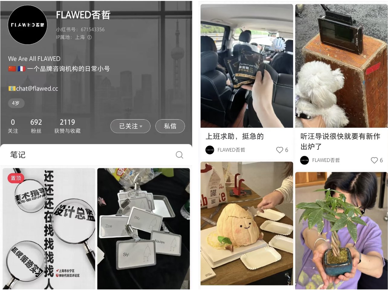 打开 FLAWED否哲的小红书,就会被他们的抽象上班日常所吸引,办公室萌宠、打工人精神状态、魔都探店日常……在这些内容中,你可以感受到他们团队的年轻化氛围。