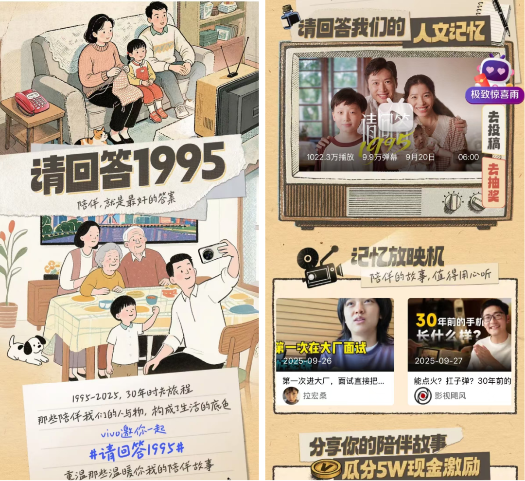 相较于聚焦品牌自身发展历程的周年营销,vivo 打开了更广阔的叙事视野,一句「请回答 1995」如同一条历史纵贯线,一头连接着家国社会变迁的宏大叙事,另一头则扎进与每个人息息相关的生活记忆,不仅立意更高,也为议题的延展与发散储备了丰富的空间。