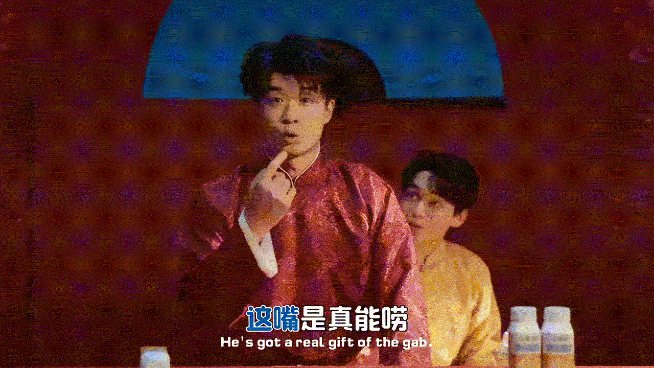 来到相声茶馆,张呈和雷子在台上为了一口安慕希争得停不下来,生动演绎出产品好喝到爆不能停下——正如天津人「话不能掉地下」再到伯伯跳水、天津卷饼,通过多个带着地地道道天津味儿的场景趣味演绎,品牌在这种抽象的氛围中轻松传递出了产品的爆珠口感与惊喜体验。而三个人的默契配合,也让《喜人奇妙夜》IP 的好感度自然延伸到了这次合作中。