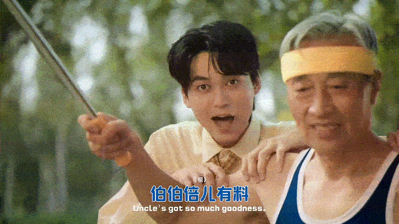 公园里,胡先煦捏着天津伯伯的手臂肌肉调侃「伯伯倍儿有料,介里面全是料」,顺势引出安慕希黄桃燕麦爆珠酸奶「好喝还好嚼,爆珠嘴里跳」的惊喜口感;