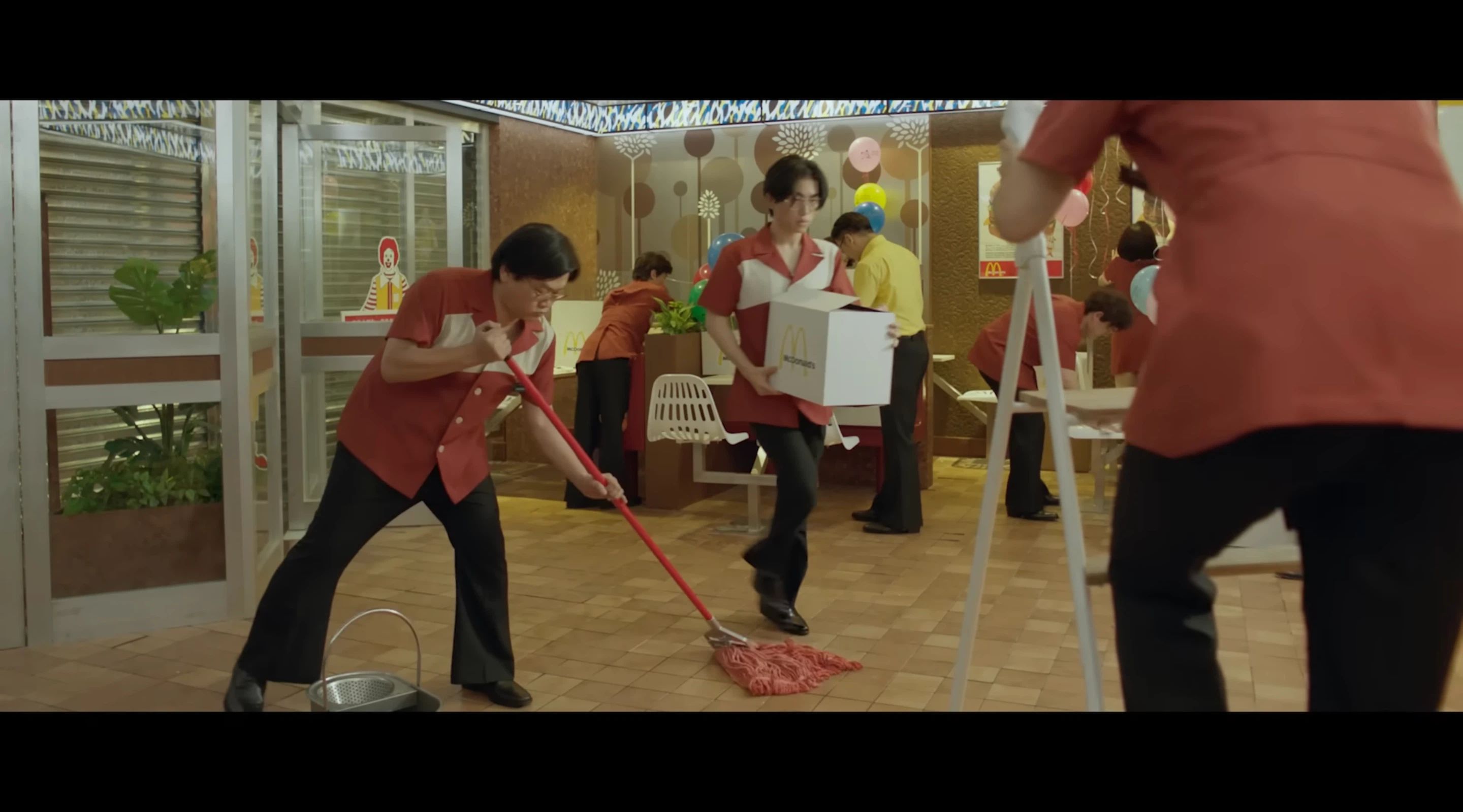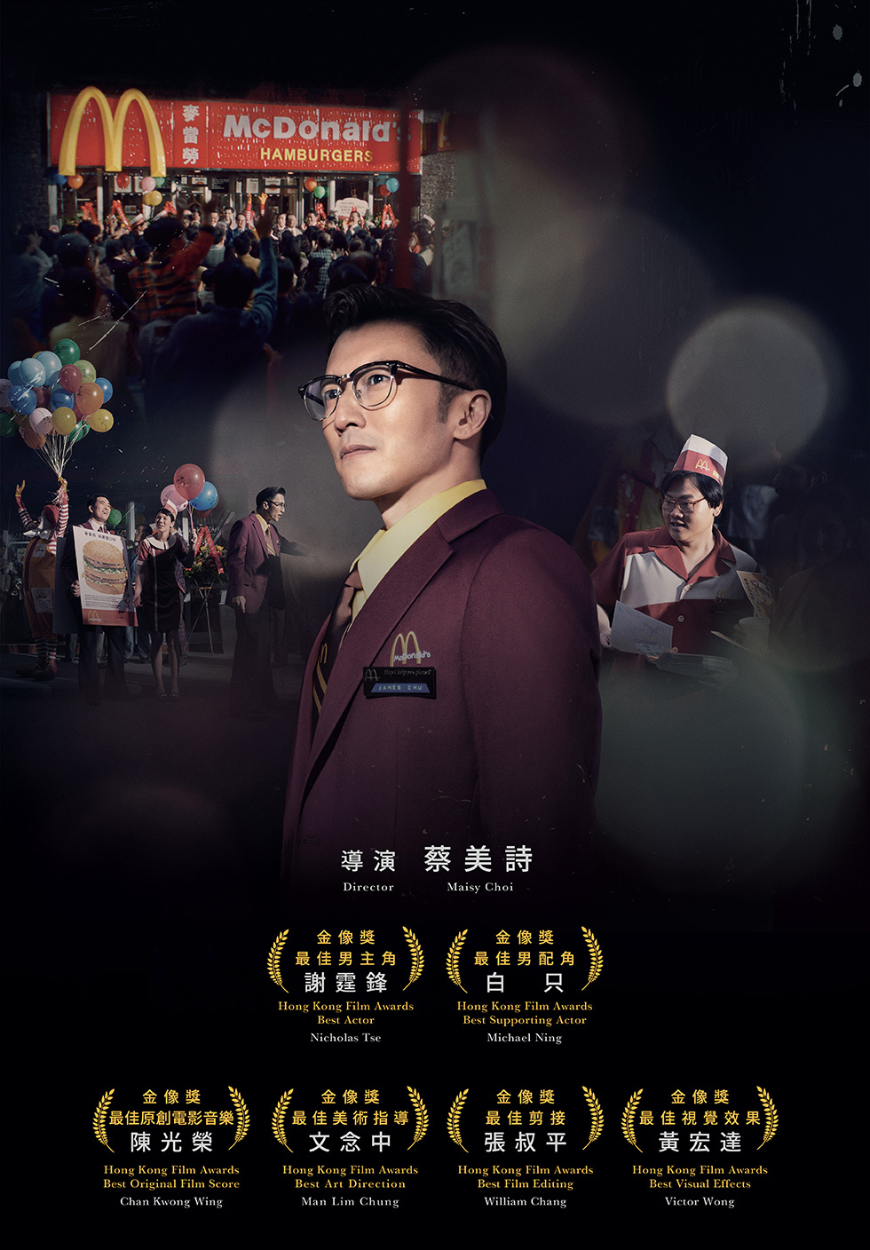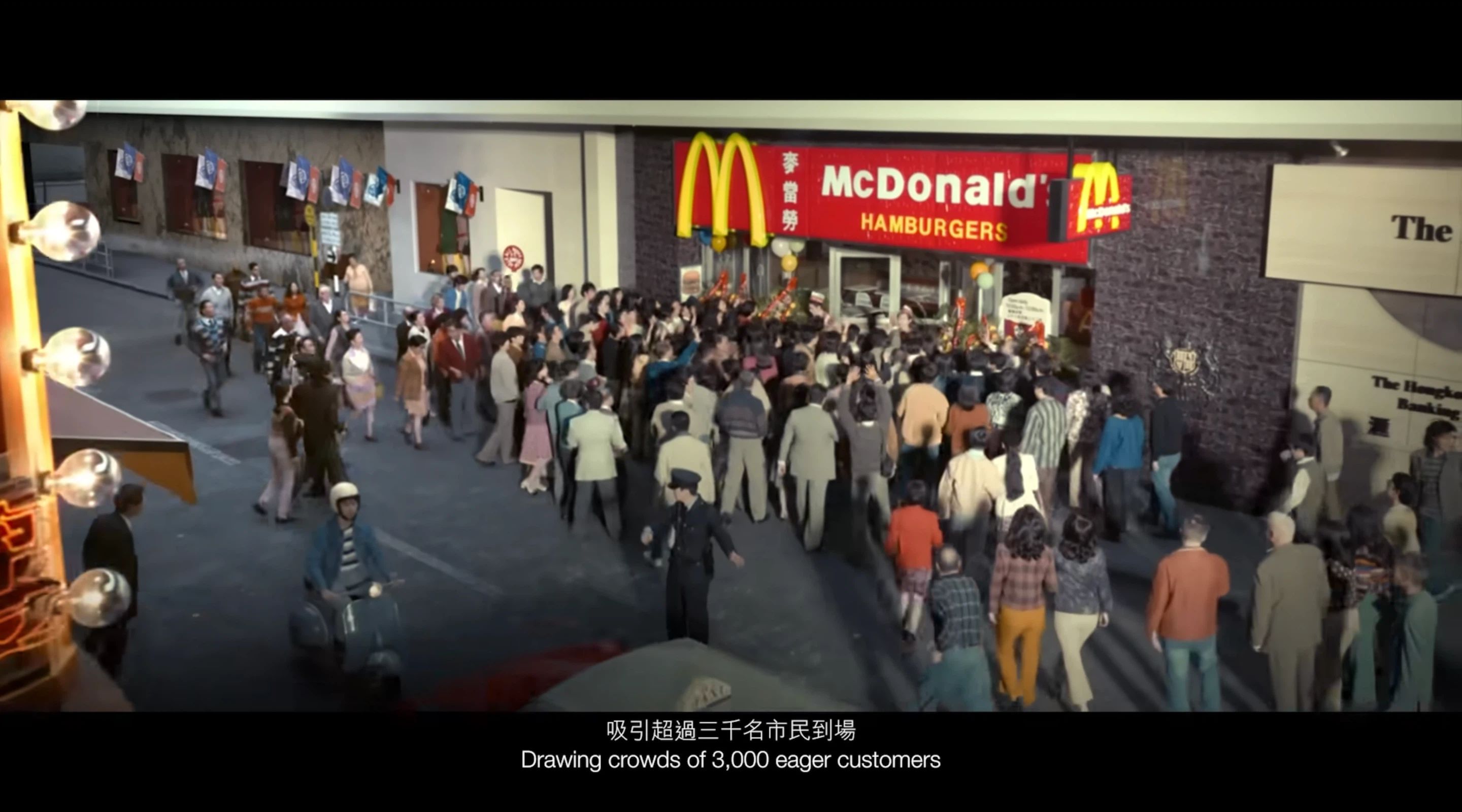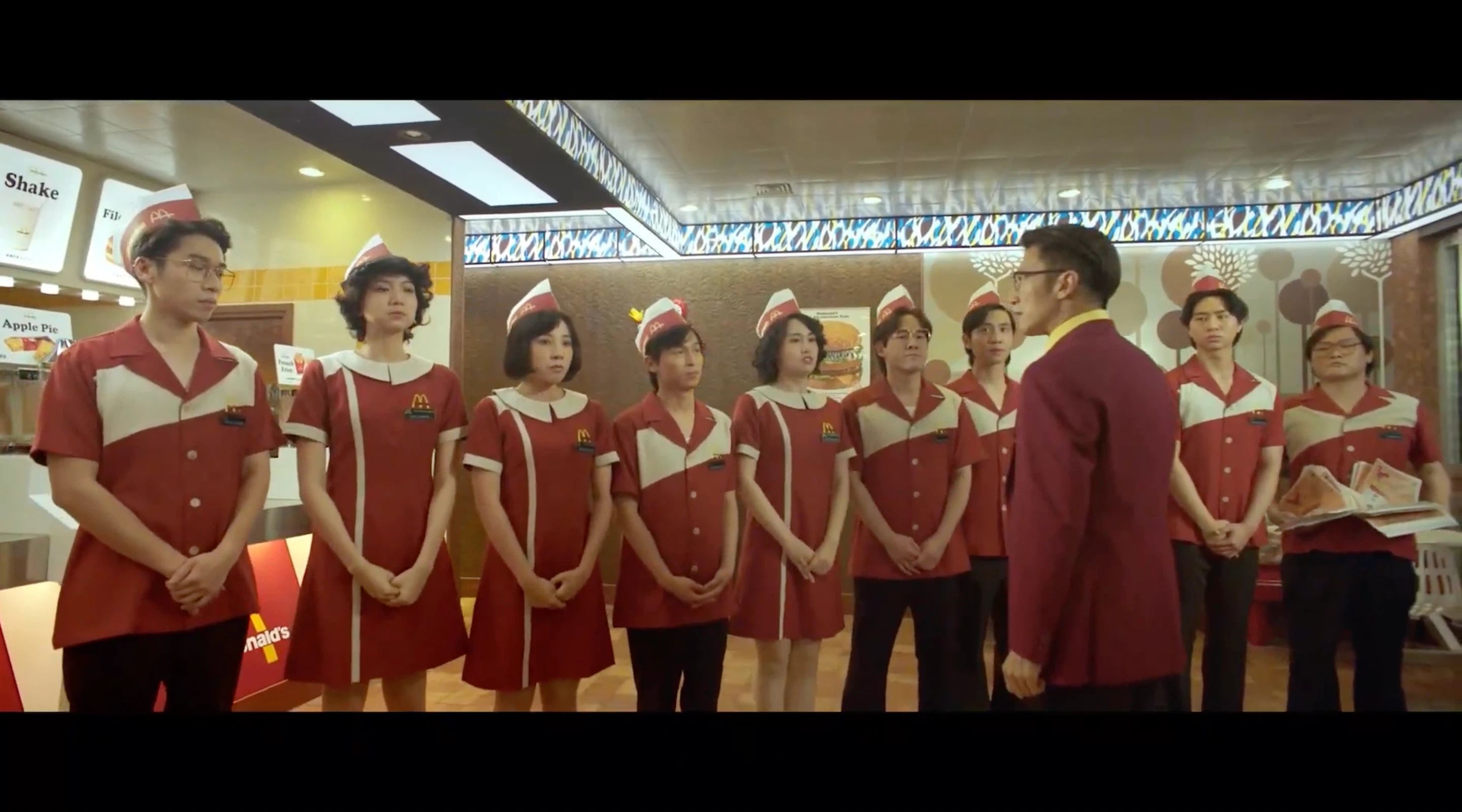 而这份细腻,离不开香港电影明星团队的倾心打造。导演蔡美诗、艺术总监文念中、剪辑师张叔平、音乐总监陈光荣等人耗时一年多,从铜锣湾百德新街的街景、复古餐牌灯箱,到经典食物包装纸、员工制服,甚至是标志性的麦当劳叔叔雕像,每一处都构成了对 70 年代香港的「微观复刻」。