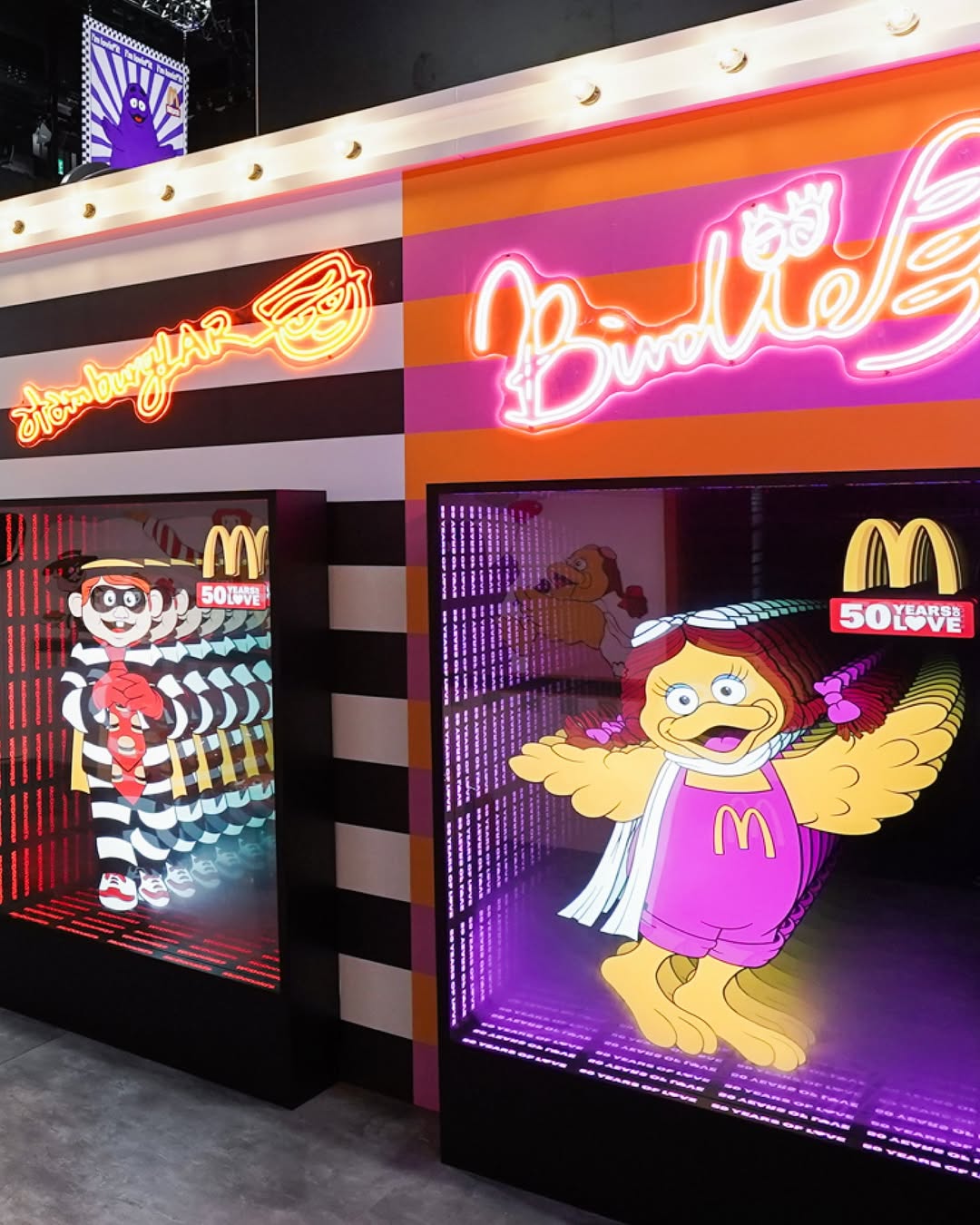 霓虹灯隧道与「秘麦空间」带来沉浸式感官体验;滑嘟嘟书局、汉堡神偷制服店、小飞飞玩具馆三个主题收藏馆,则集中展示了品牌历年的食品包装、员工制服与经典玩具。