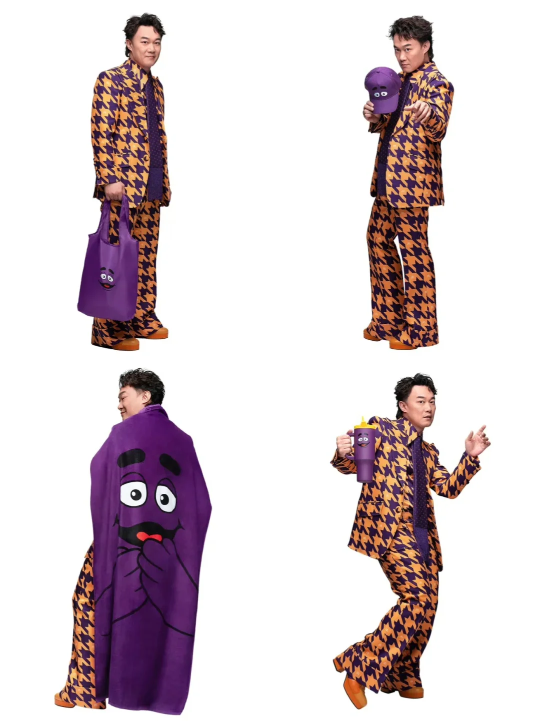 让粉丝狂喜的是,麦当劳还推出了与陈奕迅联名的周边产品,以经典 IP「滑嘟嘟」(奶昔大哥)为主题,设计融合紫色主调和卡通笑脸元素,带来棒球帽、手提袋、保温杯、袜子、沙滩巾等产品。而陈奕迅本人亲自上身演绎,「奇装异服」搭配搞怪表情,被网友笑称「这很 Eason」。