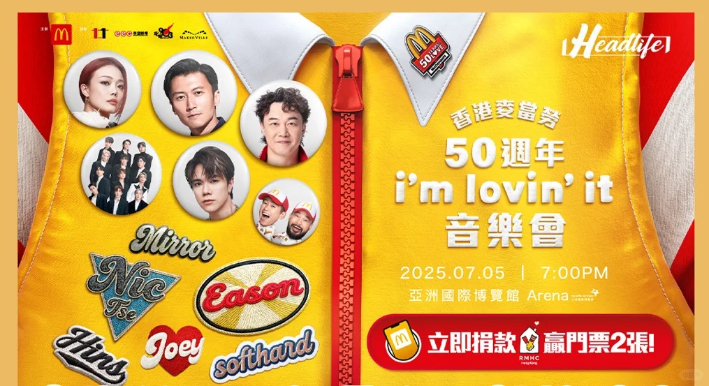除了广告和周边,麦当劳香港还在 7 月举办「50 周年 i'm lovin'it 纪念音乐会」,陈奕迅与谢霆锋、容祖儿、张敬轩、软硬及 MIRROR,等一众明星领衔出演。