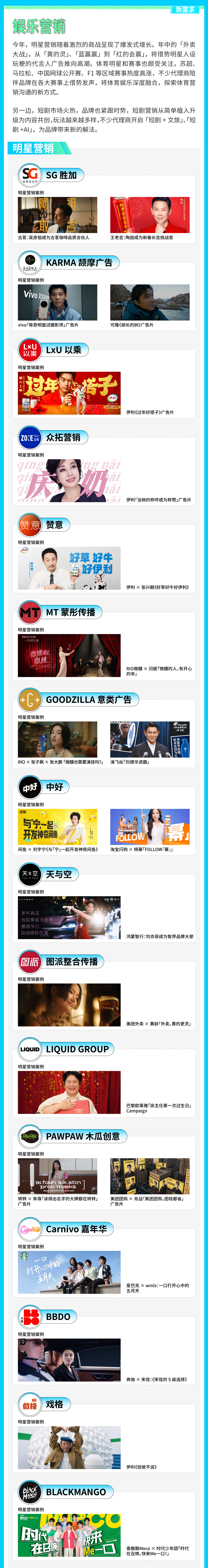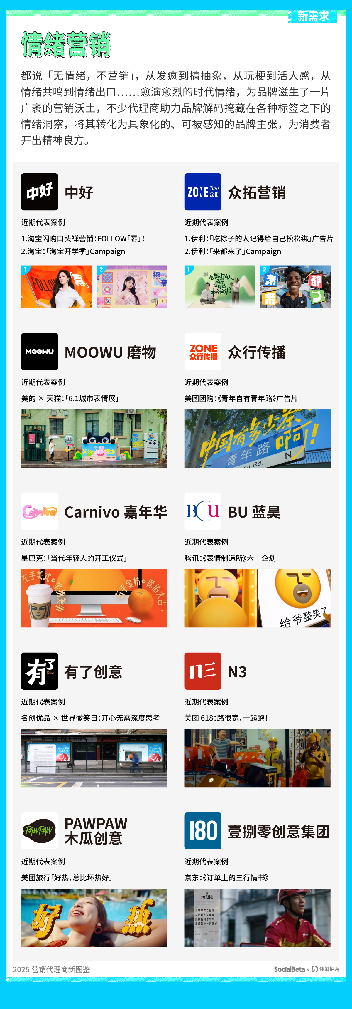 第七年发布《营销代理商新图鉴》,在行业转型不断加速的背景下,我们坚持以「新」为观察轴,对行业代理商进行年度观察和回顾,不仅致力于为品牌主、代理商与从业者各方提供更多视角参考,感知行业变化,洞察需求演变趋势;更希望通过梳理与呈现优秀代理商的创新与实践,为行业的可持续发展注入思考与启发。在变化中看见方向,在创新中汲取前行的力量。