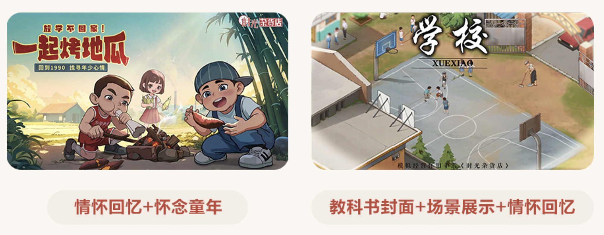 具体来说,鲸鸿动能和《时光杂货店》围绕游戏三大核心关键词「80、90 记忆」「童年回忆」「经商致富」,打造了「沉浸剧情+情怀共鸣」双引擎驱动的素材矩阵,一方面通过怀旧情绪唤醒用户的关注和认同,另一方面制造强有力的「视觉锤」,不断吸引用户点击,在游戏首发期间实现了高效拉新和心智渗透。