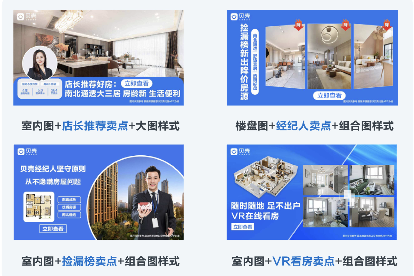 为提升广告竞争力,鲸鸿动能还携手贝壳找房探索多样化的素材样式,从增加组合图到引入经纪人角色等卖点,打造出高 eCPM 内容,有效提升投放效果。