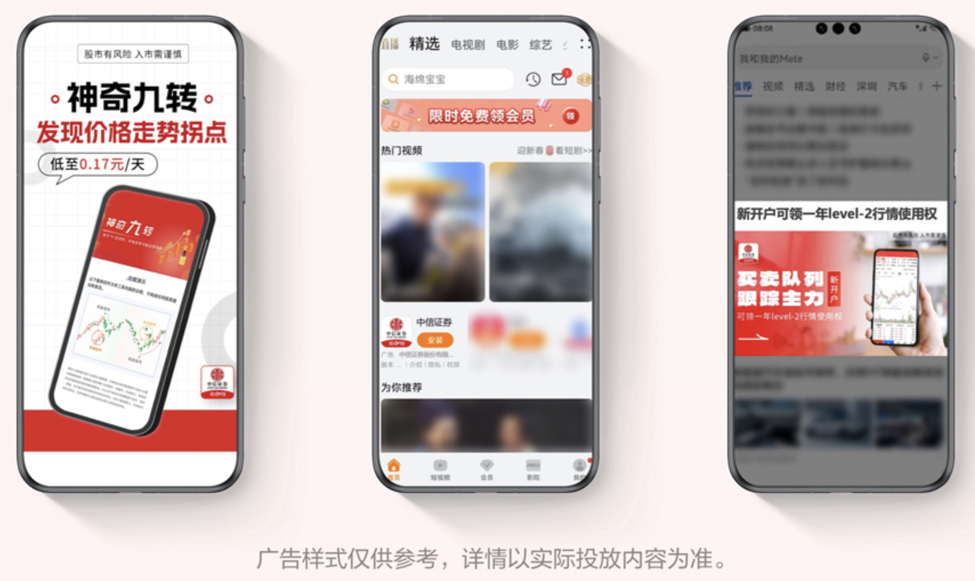 依托平台海量用户资源和精准投放技术,鲸鸿动能为中信证券拟定三步走策略:占版位、筛人群、智能出价,有效实现拉新拓客。