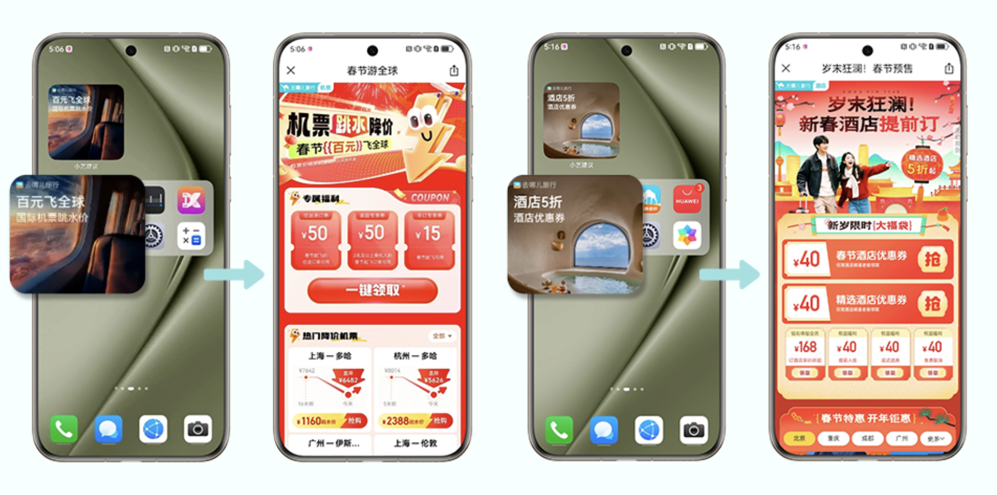 场景化版位,则是鲸鸿动能以小艺建议促活与 HarmonyOS 服务为核心,分别在用户的旅行场景搜索行为下动态推送携程机酒产品,并结合用户地域场景等标签,以全域媒体展示携程活动信息,有效提升曝光,并缩短用户决策链路。
