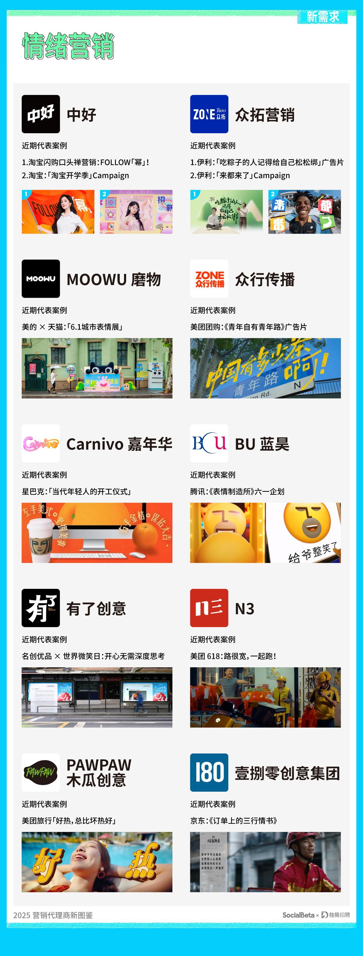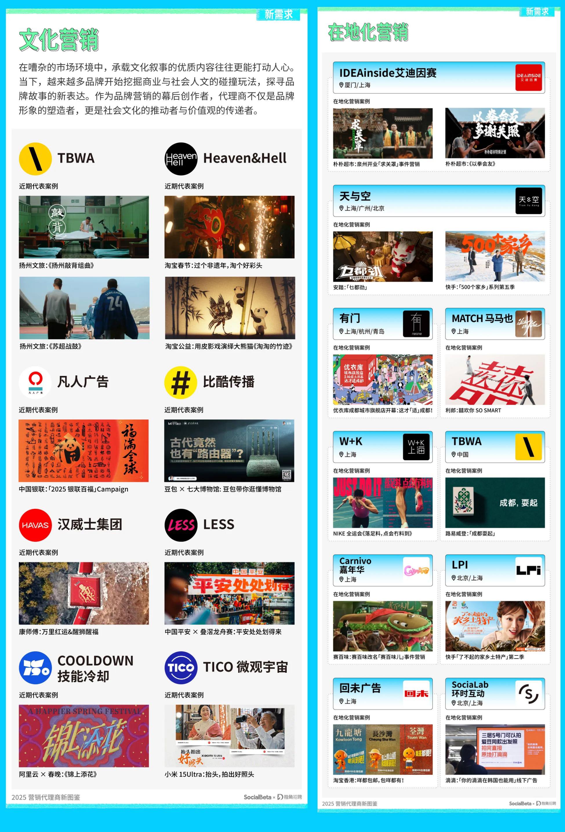 除代理商生态的新趋势外,2025 版《营销代理商新图鉴》还包含了:从作品出发,值得关注的创意代理商、整合营销代理商和新锐代理商们;行业关注度和市场需求比较高的娱乐营销、创意出海、AI 创意等细分赛道表现突出的代理商;对于行业热议的「头部集团规模化整合」、「锚定细分市场,差异化布局」的新发展动向和思路……