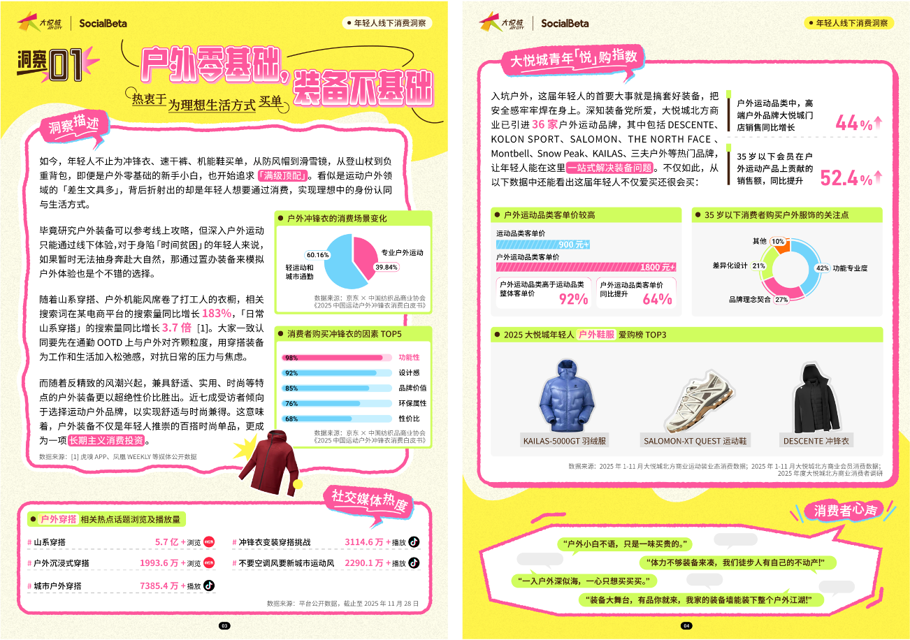 来自大悦城北方商业运动装业态 2025 年 1-11 月的消费数据就显示,户外运动品类中,高端户外大悦城门店销售同比增长了 44%;户外运动品类客单价同比提升了 64%,高于运动品类整体客单价 92%。而从 35 岁以下年轻消费者购买户外服饰的关注点来看,调研中有 42% 选择了「功能专业度」。