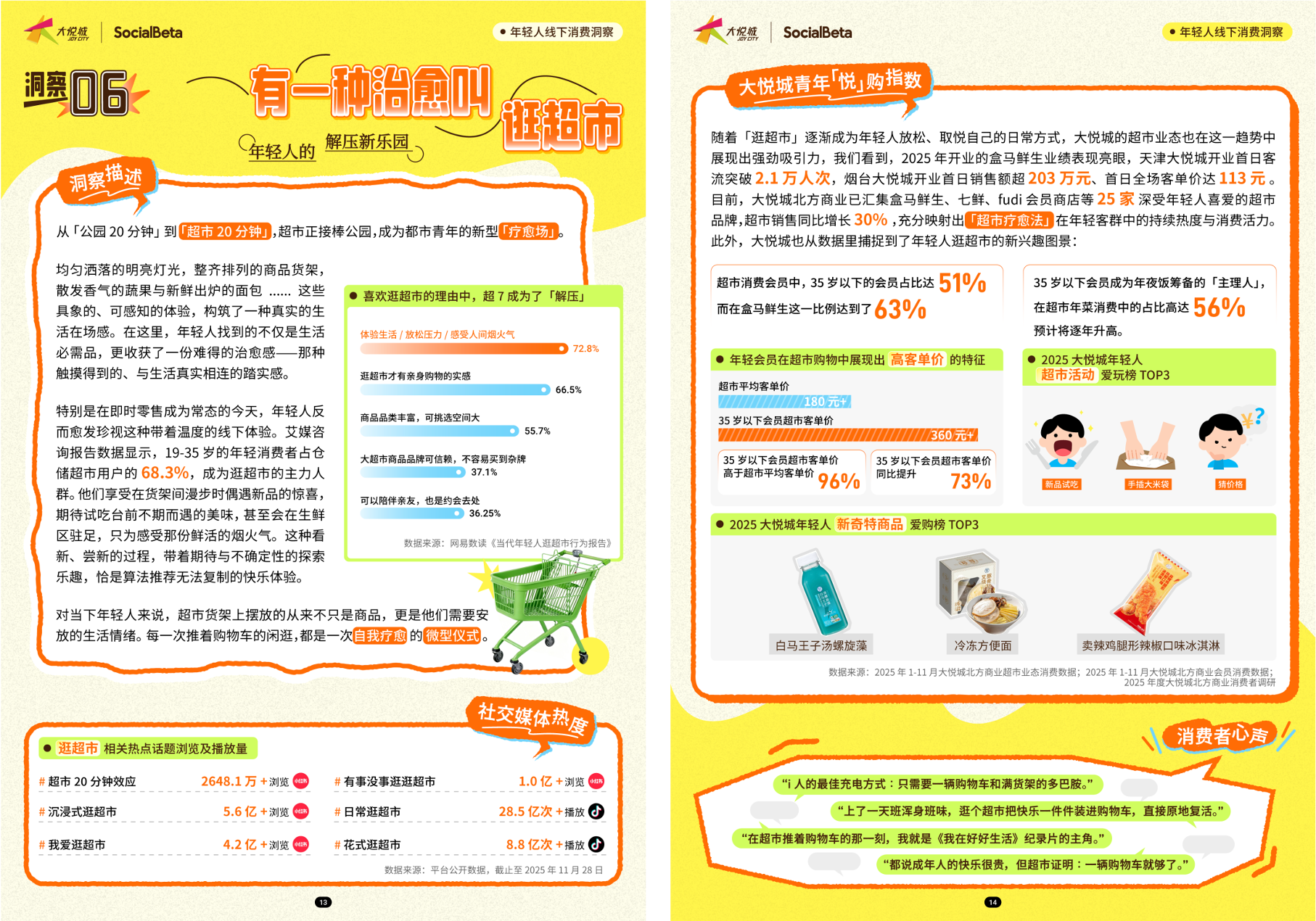 再如,「有一种治愈叫逛超市」这一洞察反映出,超市正在成为都市青年的新型「疗愈场」。在这里,年轻人找到的不仅是生活必需品,更收获了一份触摸得到的、与生活真实相连的踏实感。年轻人探索新品、体验试吃或是开发出「猜价格」的游戏,这种带着期待与不确定性的探索乐趣,恰是算法推荐无法复制的快乐体验。