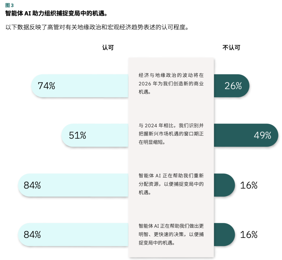 • 主动拥抱不确定性,将其转化为战略资产。调研显示,90% 的高管认为,一旦企业不具备实时运营能力,就难以保持竞争优势。因此,企业要在行动中重塑组织结构,以敏捷性为核心重新设计这些要素,同时引入支持 AI 的数据产品,提升并优化各层级的决策能力。