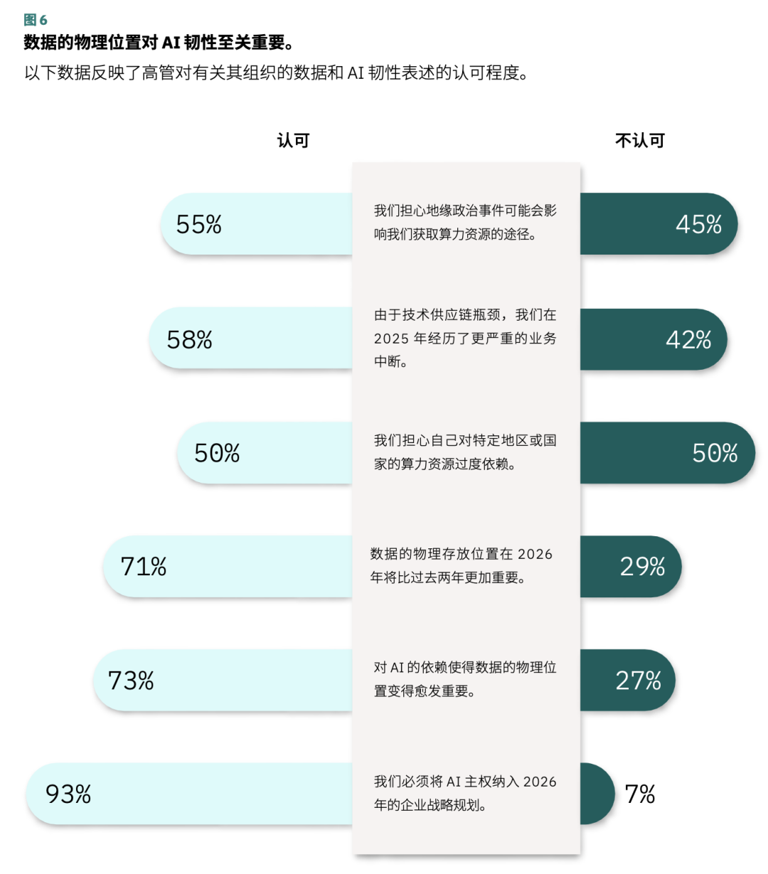 • 全球化背景下,AI 韧性离不开本地安全防护网。有 93% 的高管认为必须将 AI 主权纳入 2026 年的企业战略规划。而要增强 AI 韧性,组织必须评估自己能独立制定的战略决策,包括模型的运行位置、数据的治理方式,以及当全球系统发生故障时业务连续性的实际掌控者,在此基础上不断夯实 AI 防护体系。