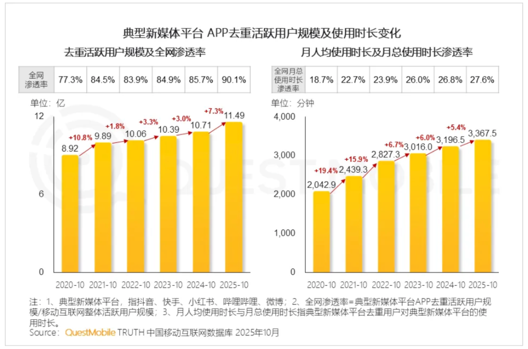 QuestMobile 发布《2025 年新媒体生态盘点》。数据显示,截止到 2025 年 10 月,典型新媒体平台 APP 去重活跃用户规模及月人均使用时长分别达 11.49 亿、3367.5 分钟,同比增幅分别为 7.3% 和 5.4%,新媒体平台用户粘性仍在稳步提升。