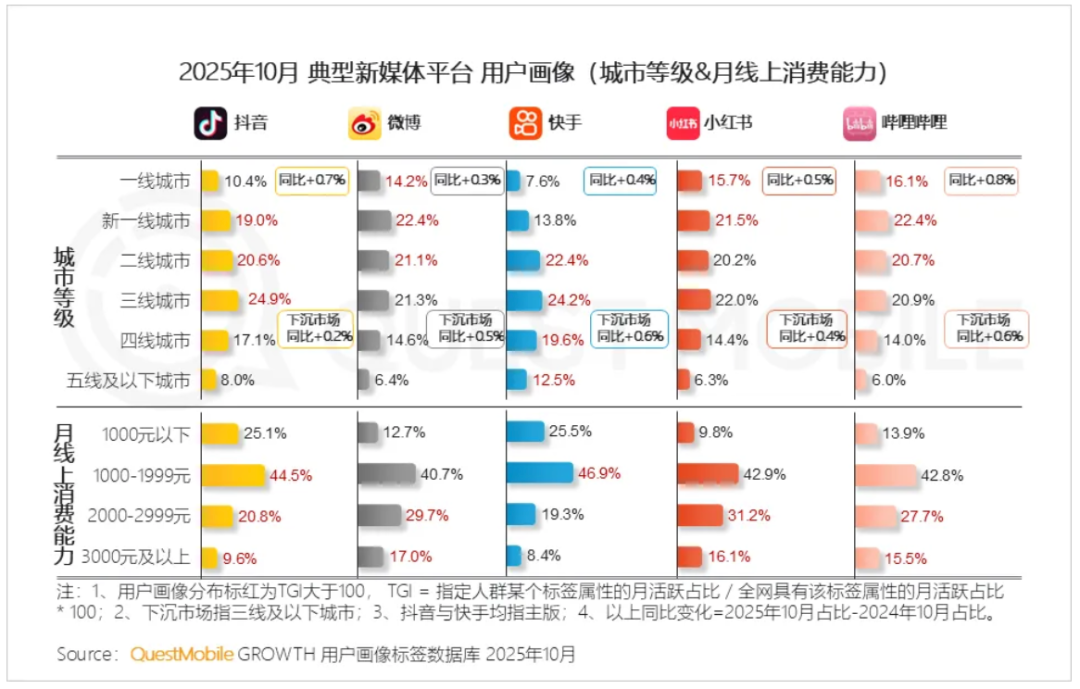 从用户画像来看,年轻与年长人群、下沉市场是核心增长源。用户已普遍脱离单一平台依赖,转向按需组合使用,多栖用户以年轻、高消费群体为主,通过不同平台满足社交、娱乐、学习等复合需求,这使得平台从「流量争夺」升级为「用户心智与时间份额」的博弈。