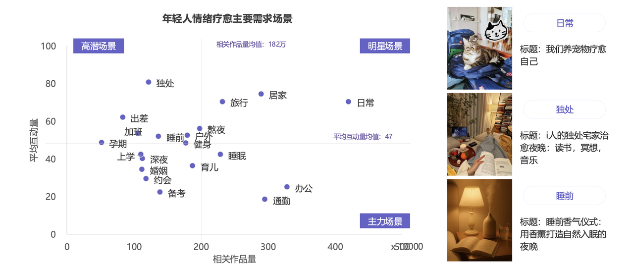 而随着年轻人越来越注重情绪价值,他们也更愿意为情绪买单,中国情绪经济市场规模逐年增长,对比 2024 年,2025 年情绪经济市场年复合增长率达到 25.6%。从社媒声量调研来看,消费者期待通过情绪消费以满足取悦自我、获得情感陪伴、缓解压力等诉求。日常、居家等是消费者进行情绪疗愈的主要场景,独处、出差、睡前等成为潜力场景。
