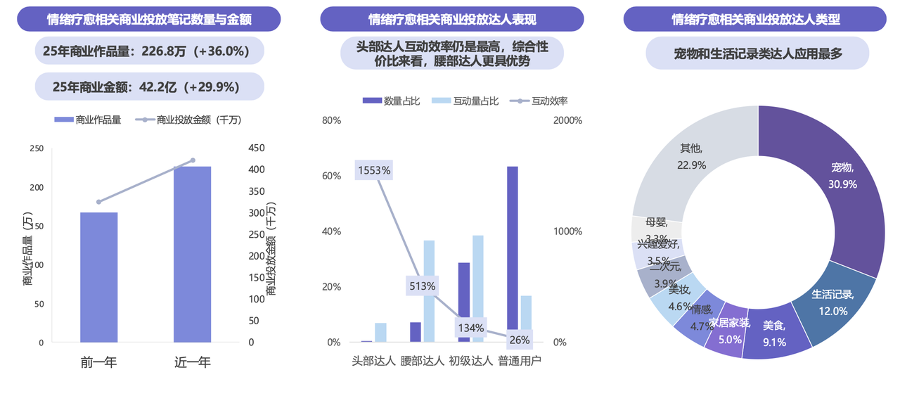 纵观情绪营销趋势,报告基于小红书、抖音两大平台特征进行了总结提炼。以小红书为例,平台情绪内容相关投放增长,2025 年商业作品量同比增长 36%。相较之下,宠物和生活记录达人疗愈系内容数量更多;场景叙事、居家好物、治愈玩具类内容互动更高。