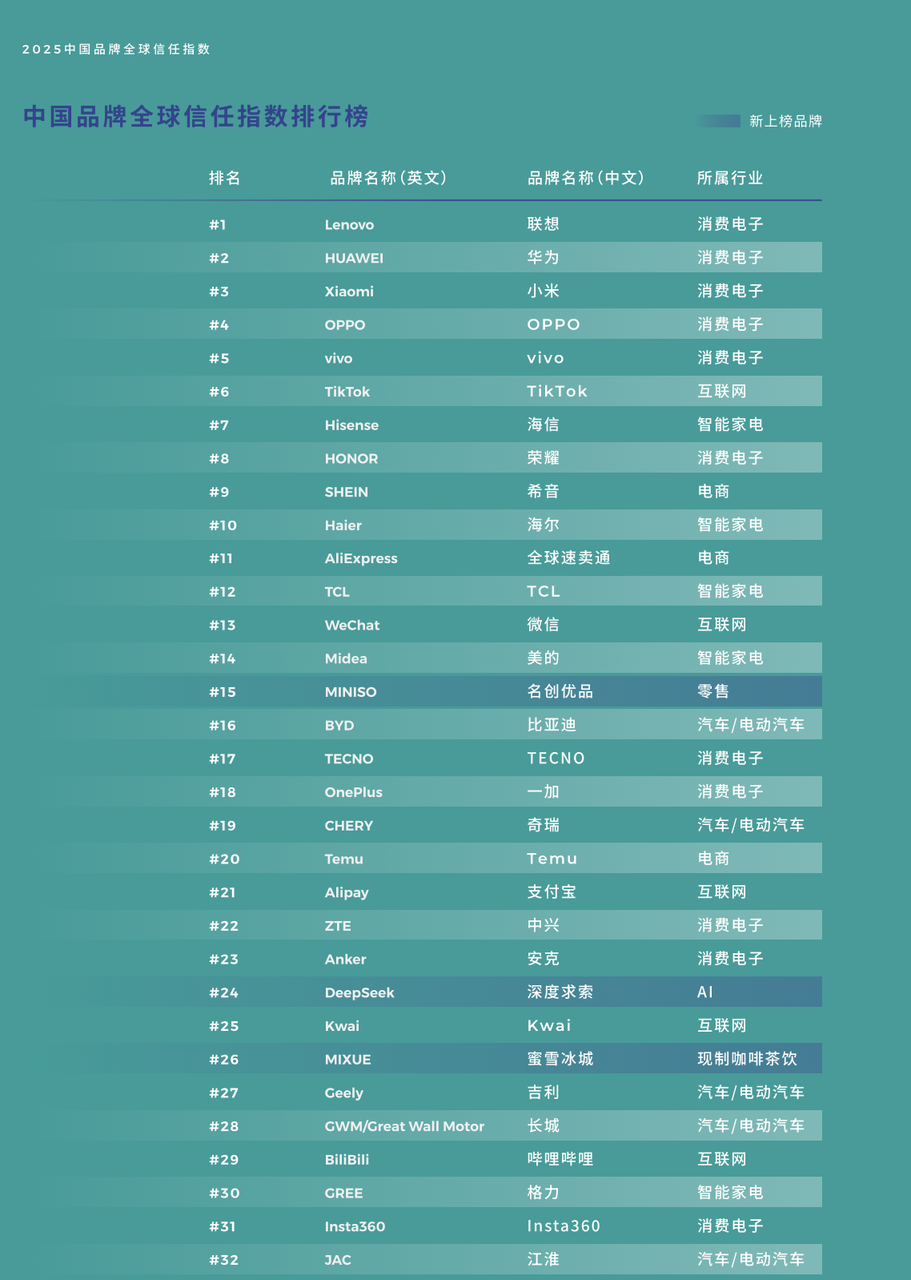 与此同时,标杆品牌引领行业信任升级的趋势显著。从榜单数据来看,消费电子行业继续领跑,前 10 名中占据 6 席,联想、华为、小米稳居排行榜前三,OPPO、vivo、荣耀等品牌紧随其后。同时,过去一年海外消费者对中国消费电子品牌的购买意愿达到 40%,超越美国(38%)和韩国(34%)。