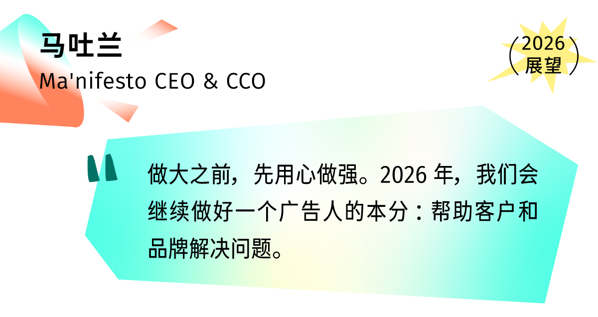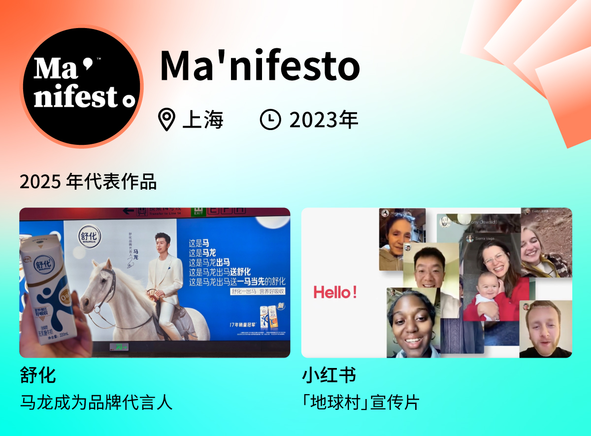 自 2023 年来,Ma'nifesto 以「为品牌创造机会」为宗旨,为客户提供量身定做的品牌咨询、品牌传播与创意内容的可执行全案服务。作为广告圈内备受关注的明星公司,在成立短短两年间,就已经创作了不少令人眼前一亮的广告作品。