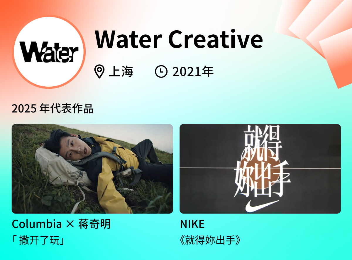 除了 NIKE,Water 还为 Columbia 2025 玩徒派对带来收官视频「 撒开了玩」,携手代言人蒋奇明,生动诠释品牌所倡导的玩徒精神与户外生活方式;也在炎炎夏日,为儿童运动生活方式品牌 moodytiger 带来了两支轻松愉快的《捉迷藏》《踩影子》广告片,传达了品牌陪伴小朋友尽情享受大自然,释放天性的主张。