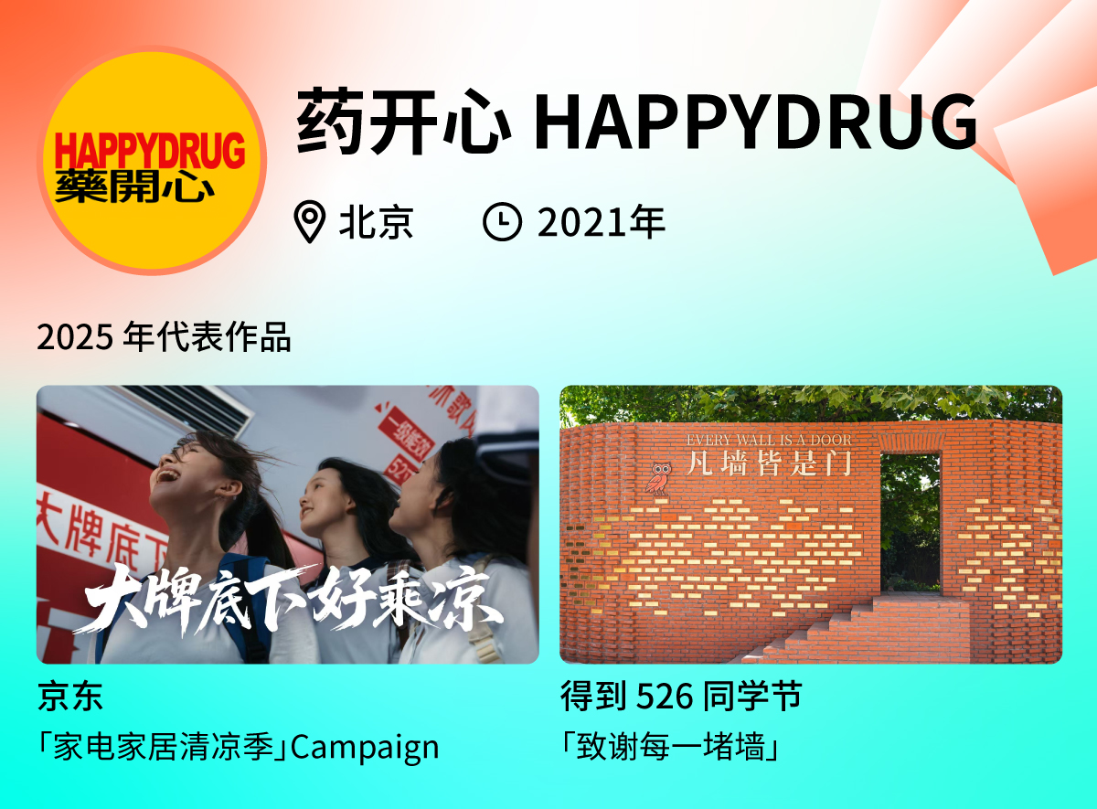 药开心 HAPPYDRUG,一家先锋的创意整合营销公司。过去的一年,他们整合多种创意形式,从 TVC、户外广告到事件营销、创意传播,以多元解法助力品牌破圈传播,扩大声量。