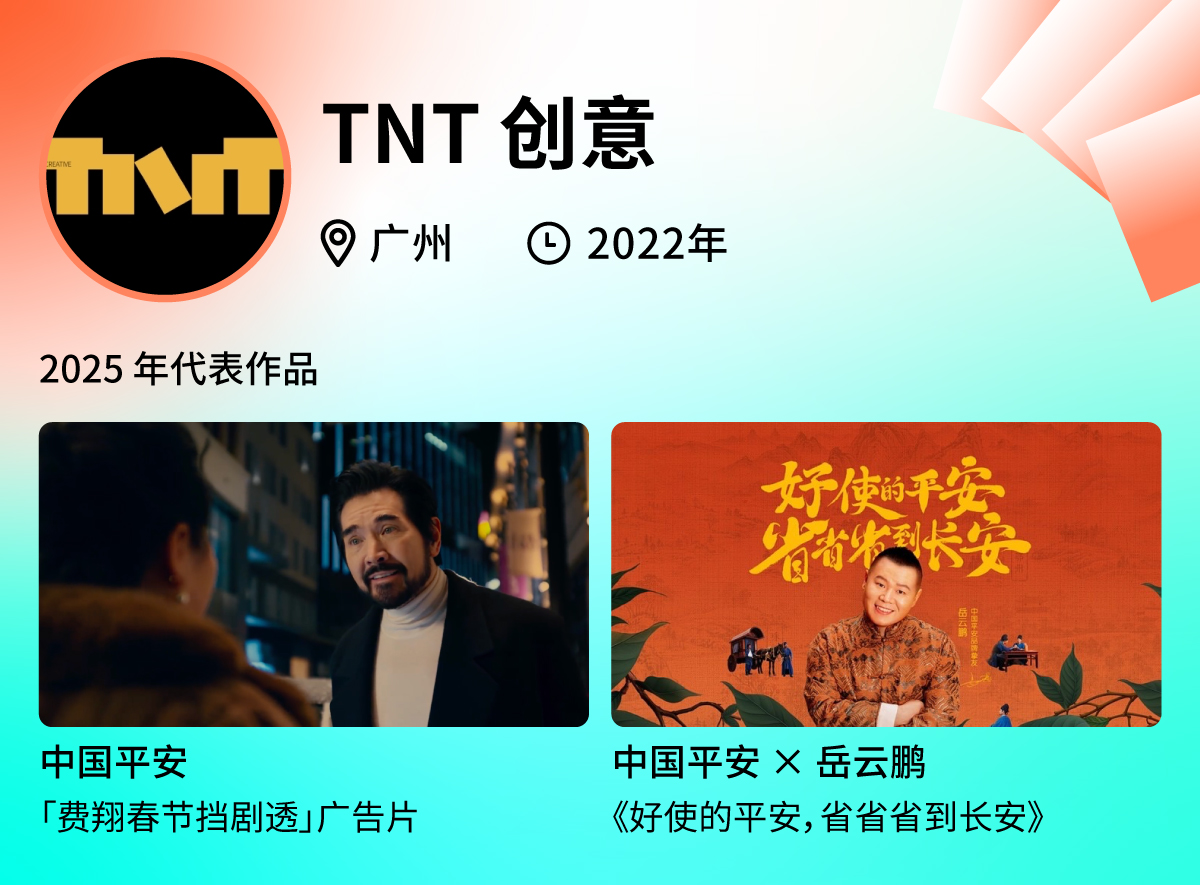 2025 年,TNT 创意持续助力中国平安,借势影视剧热度有效发声。年初,在春节档电影上映之际,TNT 创意助力中国平安借势《封神榜 2》打造「费翔春节挡剧透」广告片,将中国平安业务优势与代言人费翔「挡」剧透相结合,借势春节档整活,打造 CNY 营销出圈之作。年中,随着电视剧《长安的荔枝》热播,TNT 为中国平安带来《好使的平安,省省省到长安》,借势岳云鹏的剧中身份,通过「电影」预告式的广告片演绎平安金融服务的便捷性,在电视剧热播期,为品牌增加曝光与讨论。