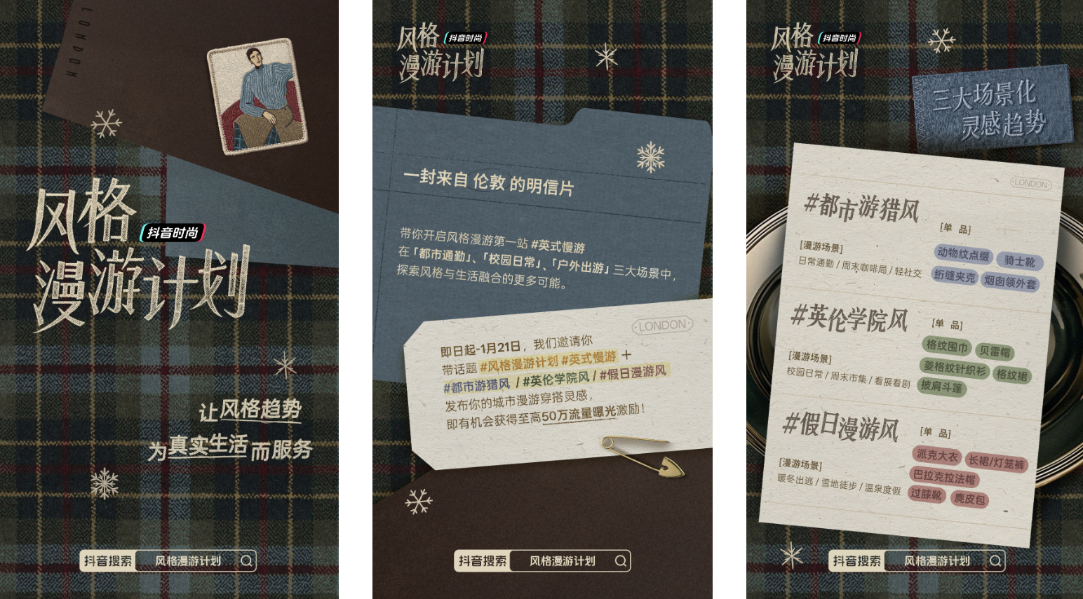 在庞大而持续生长的 UGC 内容中捕捉到共通信号,抖音时尚推出了「风格漫游计划」,通过提炼出通勤、校园、出游三类具有代表性的生活场景,推动 #都市游猎风、#英伦学院风、#假日漫游风 等话题进一步发酵。