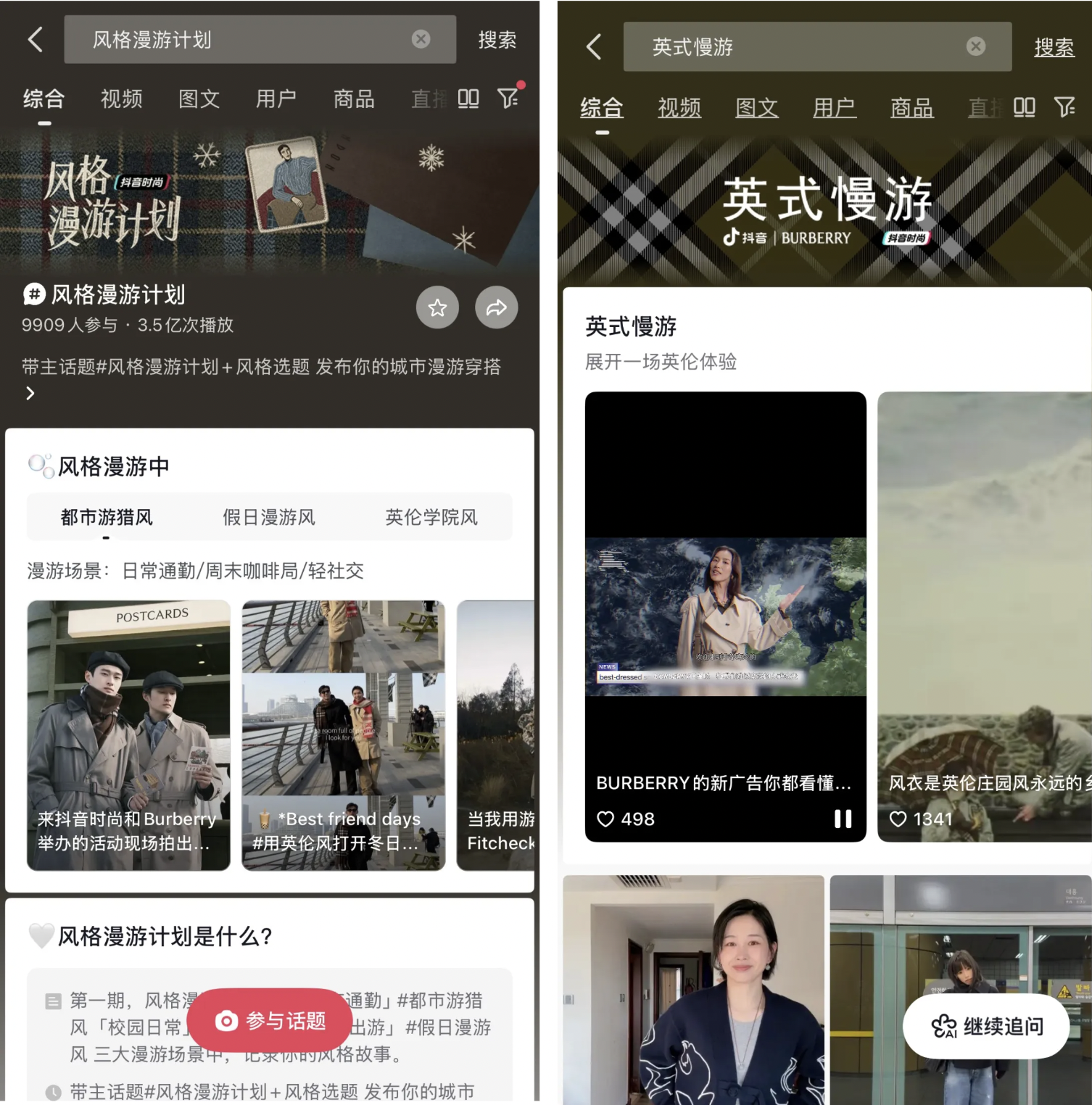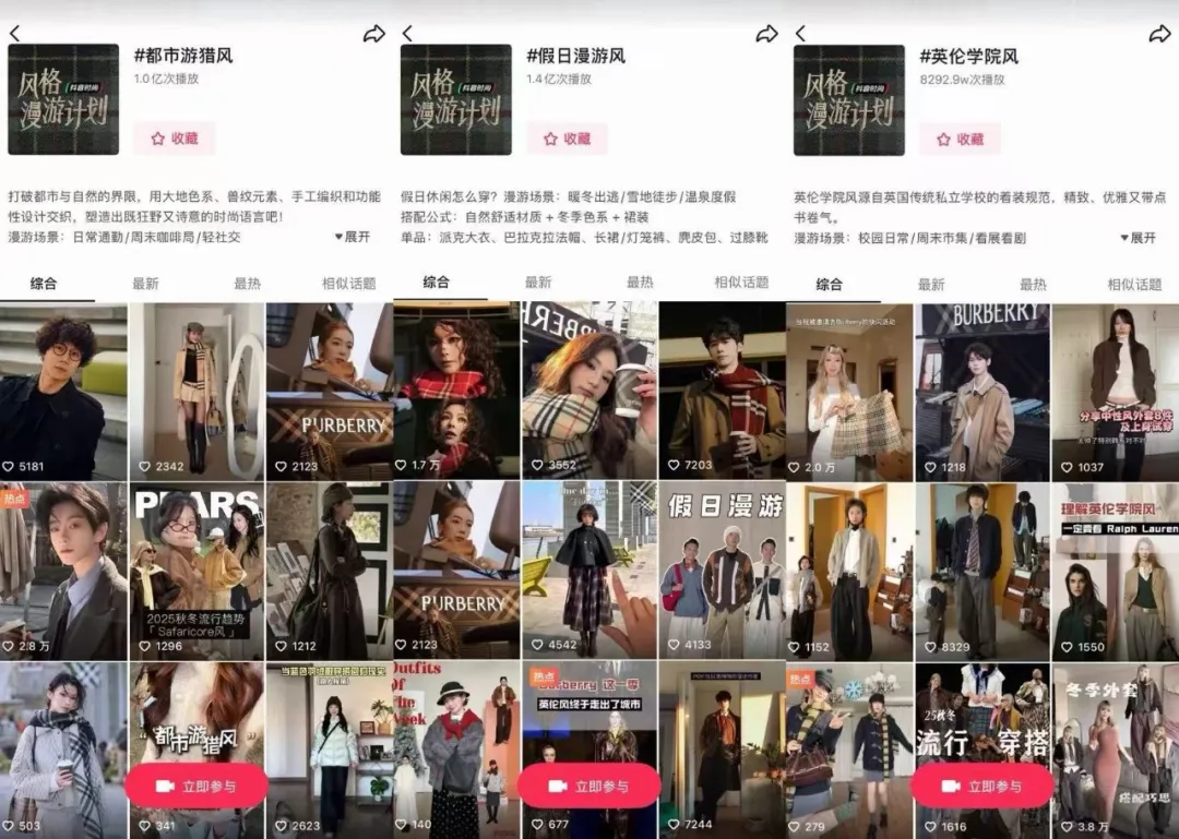 活动上线后,借助抖音成熟的话题运营能力,#风格漫游计划 及#都市游猎风、#英伦学院风、#假日漫游风 三大话题的影响力迅速放大,累计播放量已超过 6.8 亿次,成为发源于抖音的趋势样本。