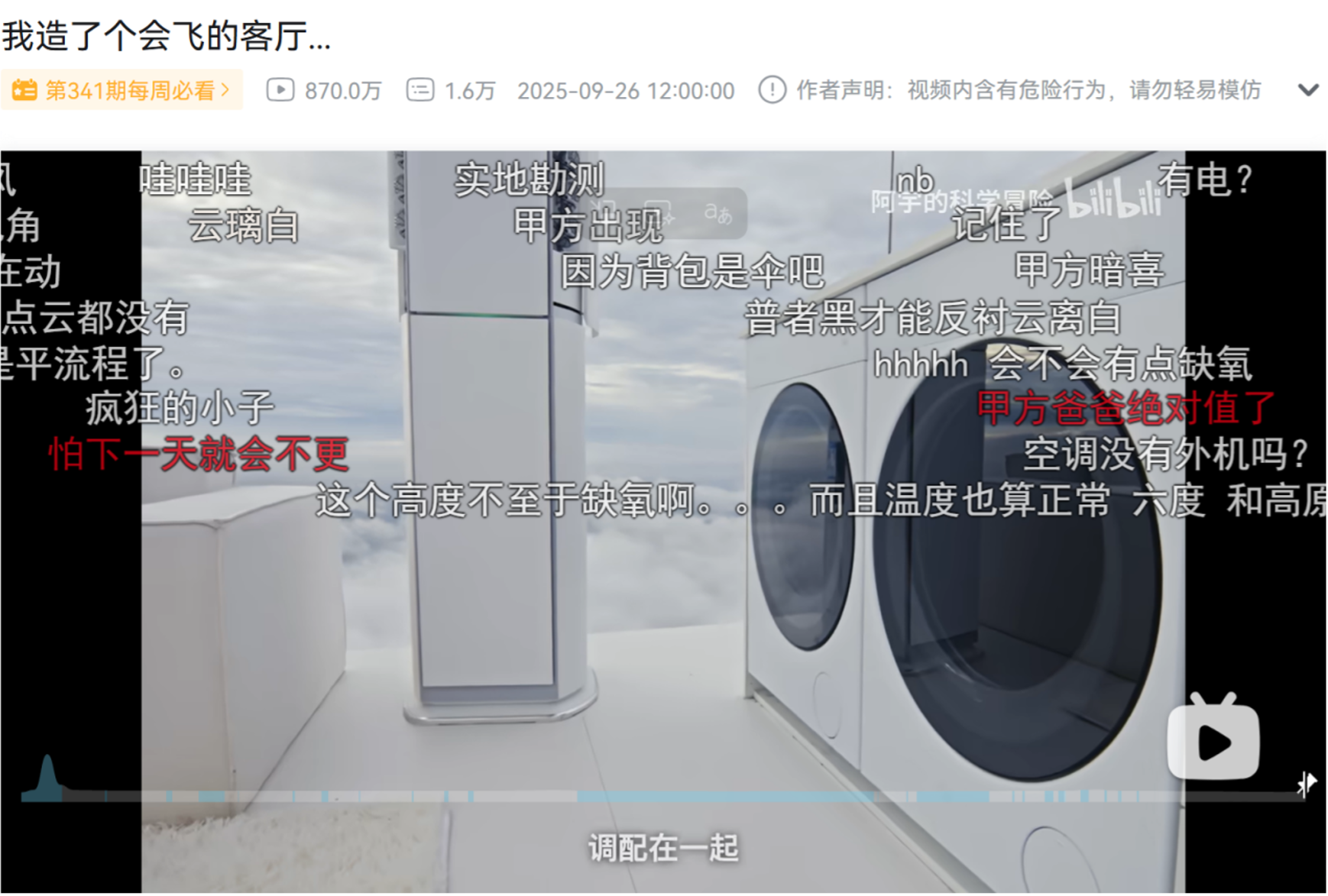 在 B 站,好的商业可以是好内容本身。2025 年,品牌商单在 B 站每周必看榜的占比达到 24%。A2 奶粉和 UP 主@爱打灭霸的响指君,用自家猫咪和老鼠还原动画片《猫和老鼠》奶粉失窃的片段,激发起 95 后人群的童年回忆,也唤醒他们消费成人奶粉的需求;为了让用户对 COLMO 新品「云璃白」家电有最直观的了解,UP 主@神奇阿宇 Ayu 脑洞大开,直接把客厅搬到 2000 米高空,在云层中体验「云璃白」电器。该视频不仅登上每周必看榜,屏幕中还不断涌现「甲方爸爸暗喜」等弹幕。