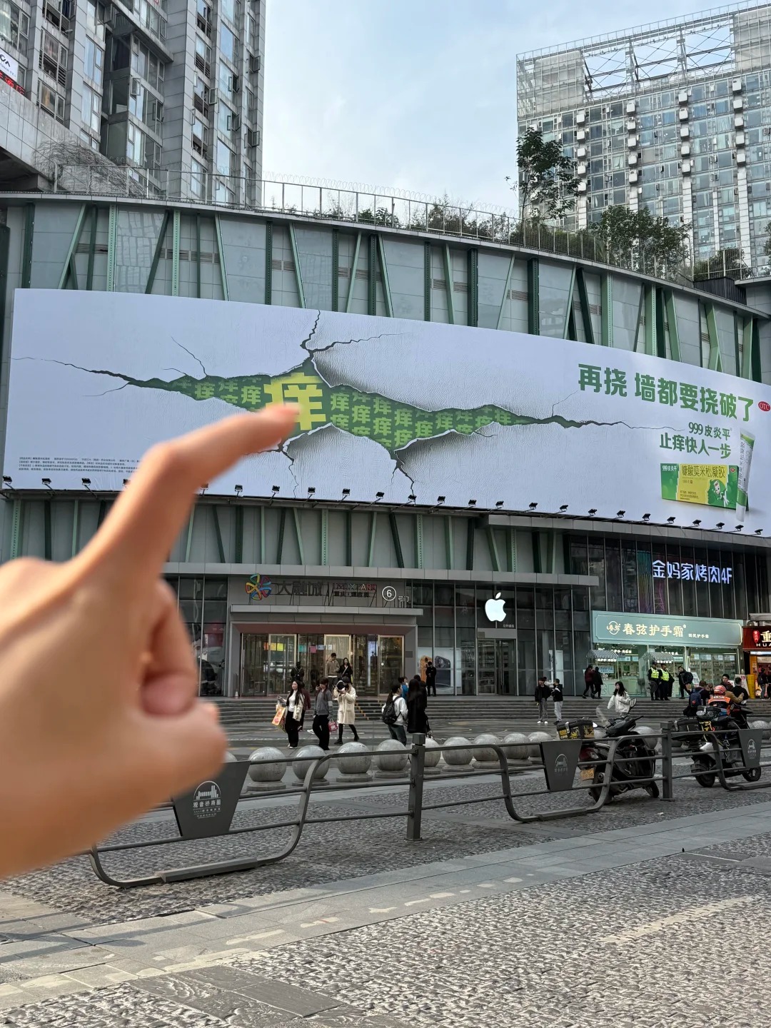 首先是在重庆观音桥大屏上搞起了「墙裂」抽象。一大片白墙从中间裂开,这样的破坏情况感觉无论是谁路过都想停下来看两眼,结果发现中间露出的是许多个「痒」。旁边配上的「再挠,墙都要破了」的文案,则将这幅画面进行了转译——挠得停不下来? 999 皮炎平可以帮你实现快速止痒。