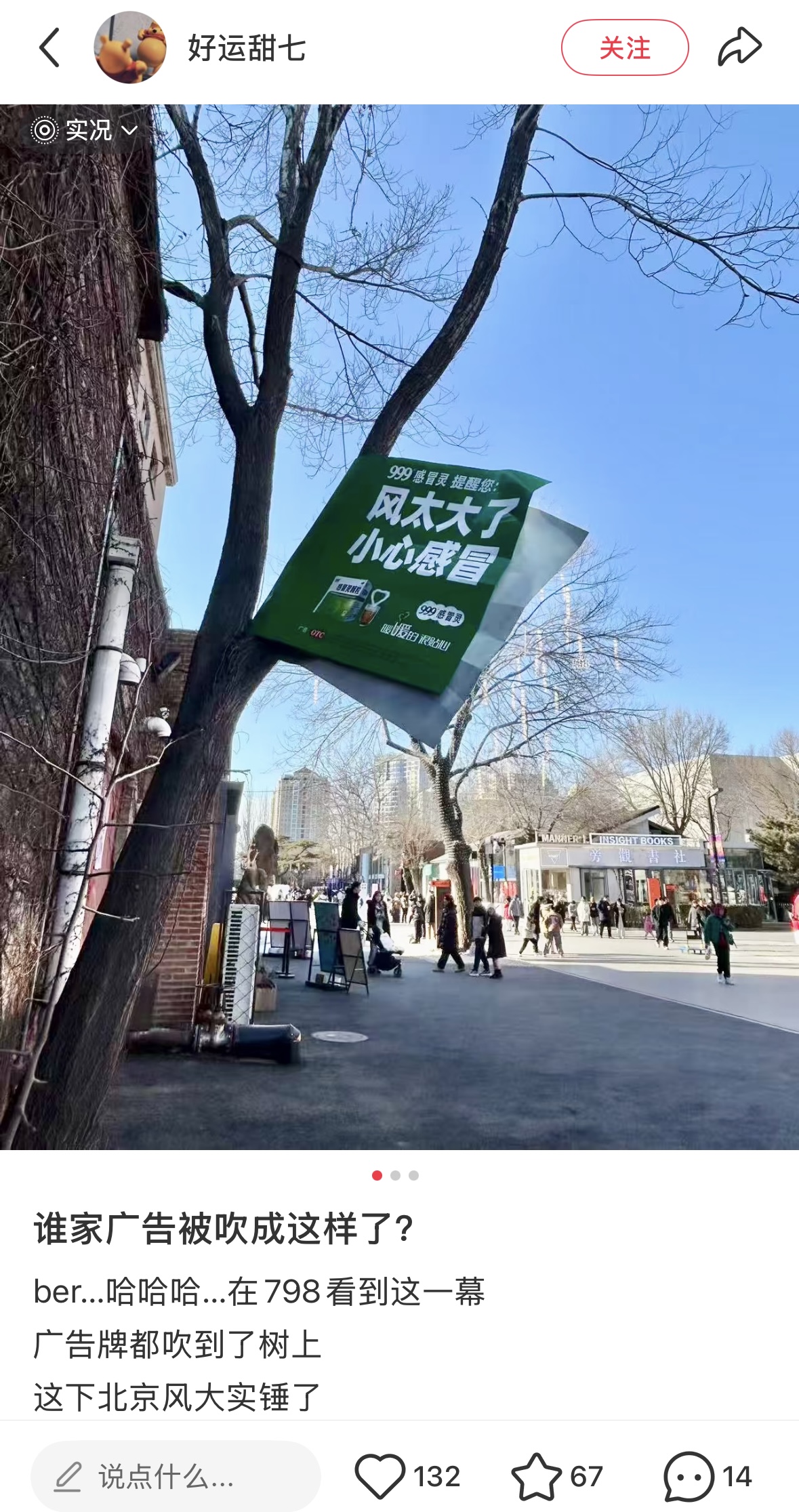 前段时间,北京大风无情,直接平等创飞所有人。999 感冒灵的广告牌也仿佛被狂风席卷过一般,皱皱巴巴挂在树上,配上「风太大了,注意保暖」等文案,既应景又醒目。不只是路过的行人,就连网友们也纷纷调侃:「北京大风实锤了」「顶着妖风营业的最暖广告」。
