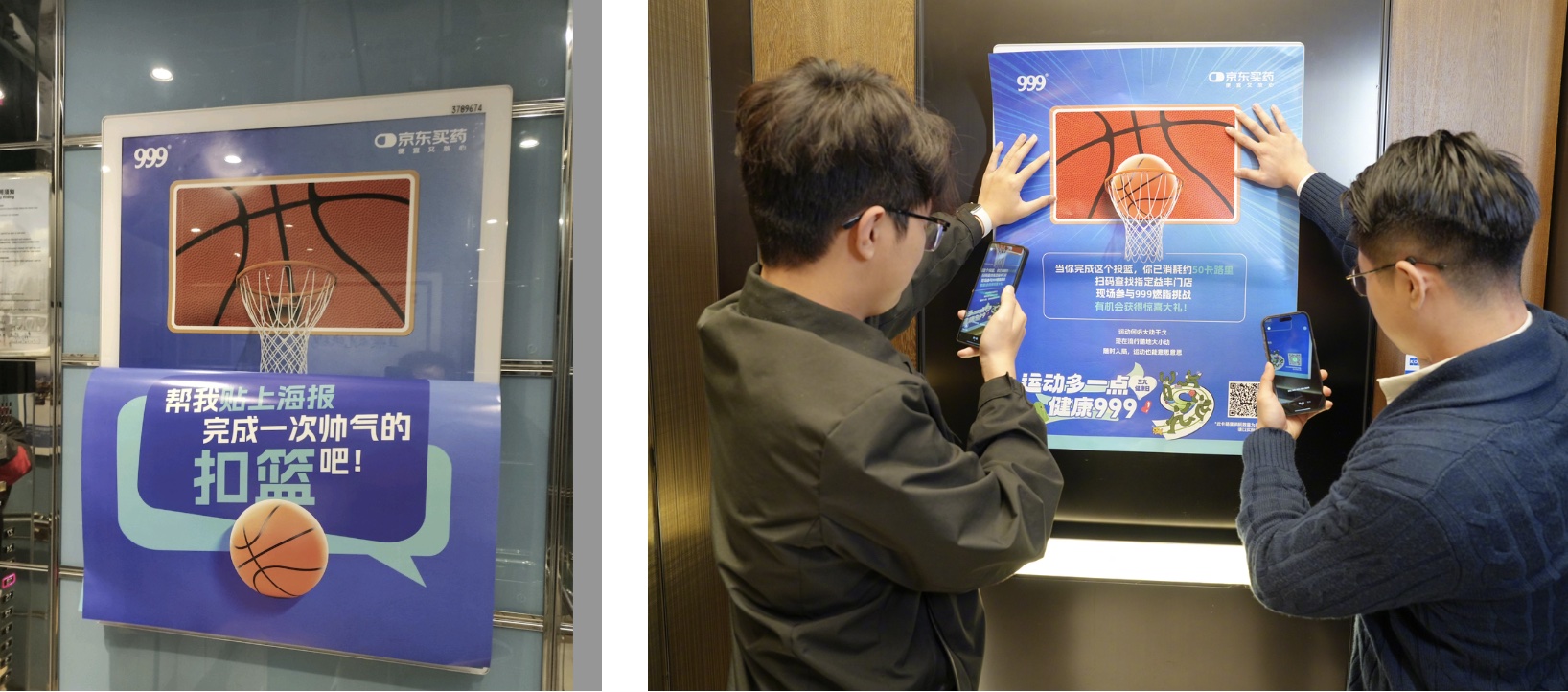在去年 3 月 9 日「三九健康日」,999 主品牌以「运动多一点,健康 999」为主题,推出互动运动海报。一张「扣篮」海报,利用半脱落设计引导路人粘贴,完成「投篮」动作的同时,也传递了「完成一次约消耗 50 卡路里」的健康信息。