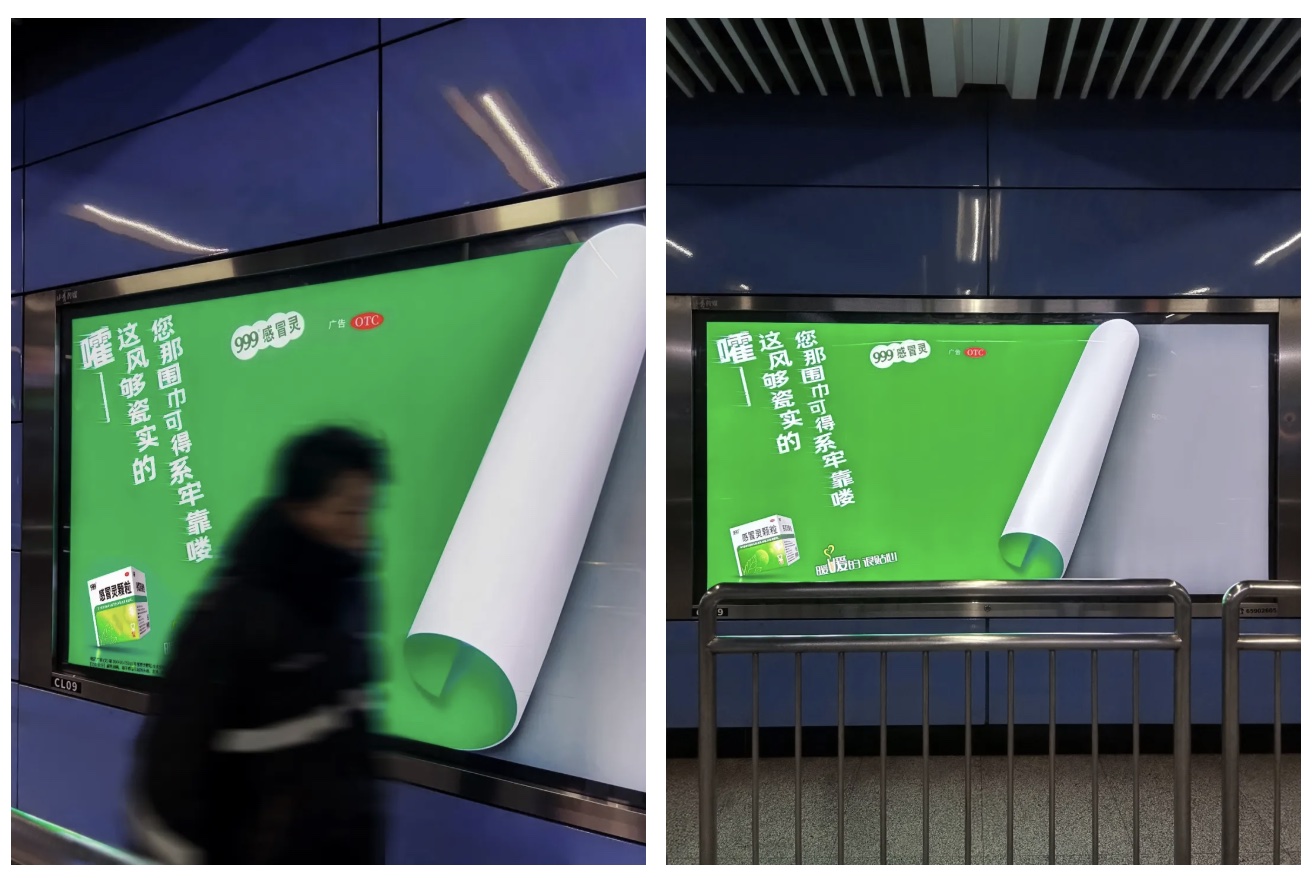 此次 999 感冒灵抓住大风降温的天气「热点」,不仅通过户外创意巧妙融入自然场景,更具象化演绎出了大众对大风降温的真实体感。延续这一思路,999 感冒灵还将地铁站内的平面海报做出了被风「吹起」的视觉效果,契合大风主题的同时,用仿佛老友问候又自带北京口音的文案,进一步营造出关怀感。