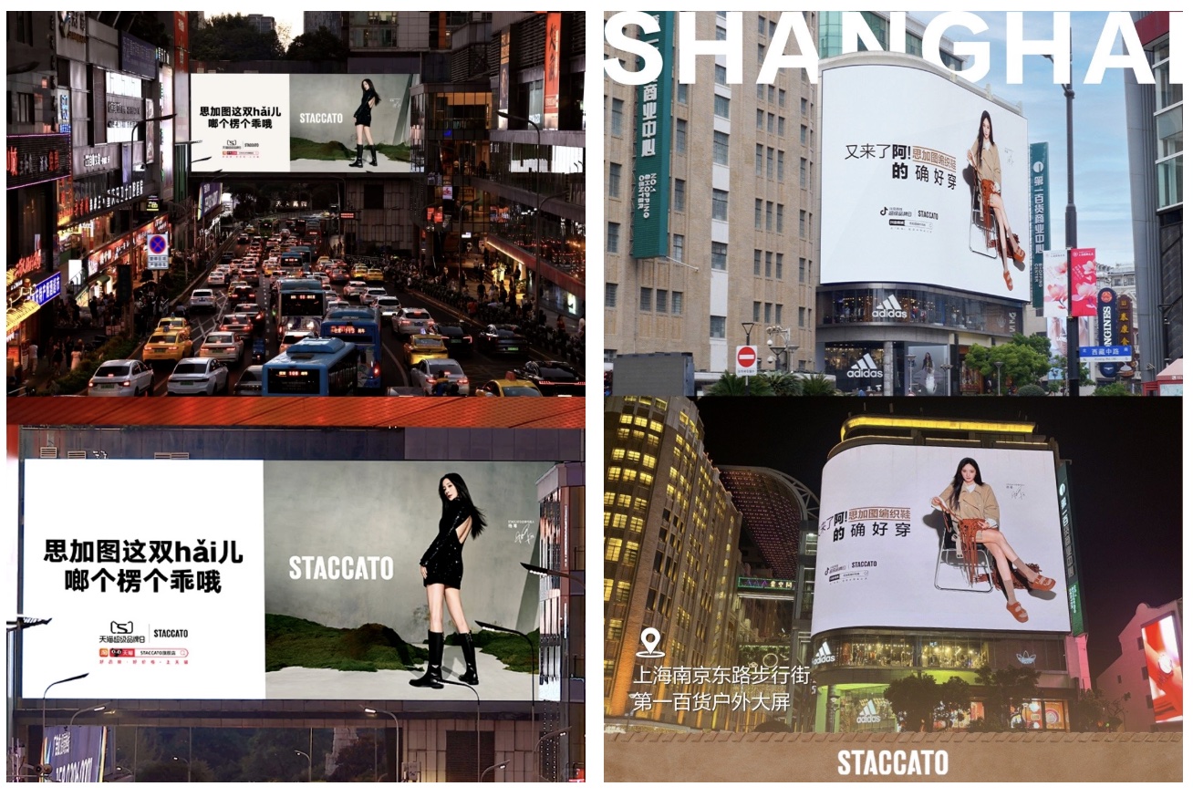 在邀请先天抽象营销圣体杨幂担任代言人后,思加图的线下广告也一路开挂了,从活学活用方言谐音梗「思加图这双 hǎī 儿啷个楞个乖哦」「还是思加图的鞋,深得圳心」,到将一句带有「买鞋子阿?的确得去思加图」的文案海报直接放在了上海南京东路阿迪达斯门店上方大屏中,正巧杨幂又是阿迪达斯之前的代言人,浓浓商战令人会心一笑。