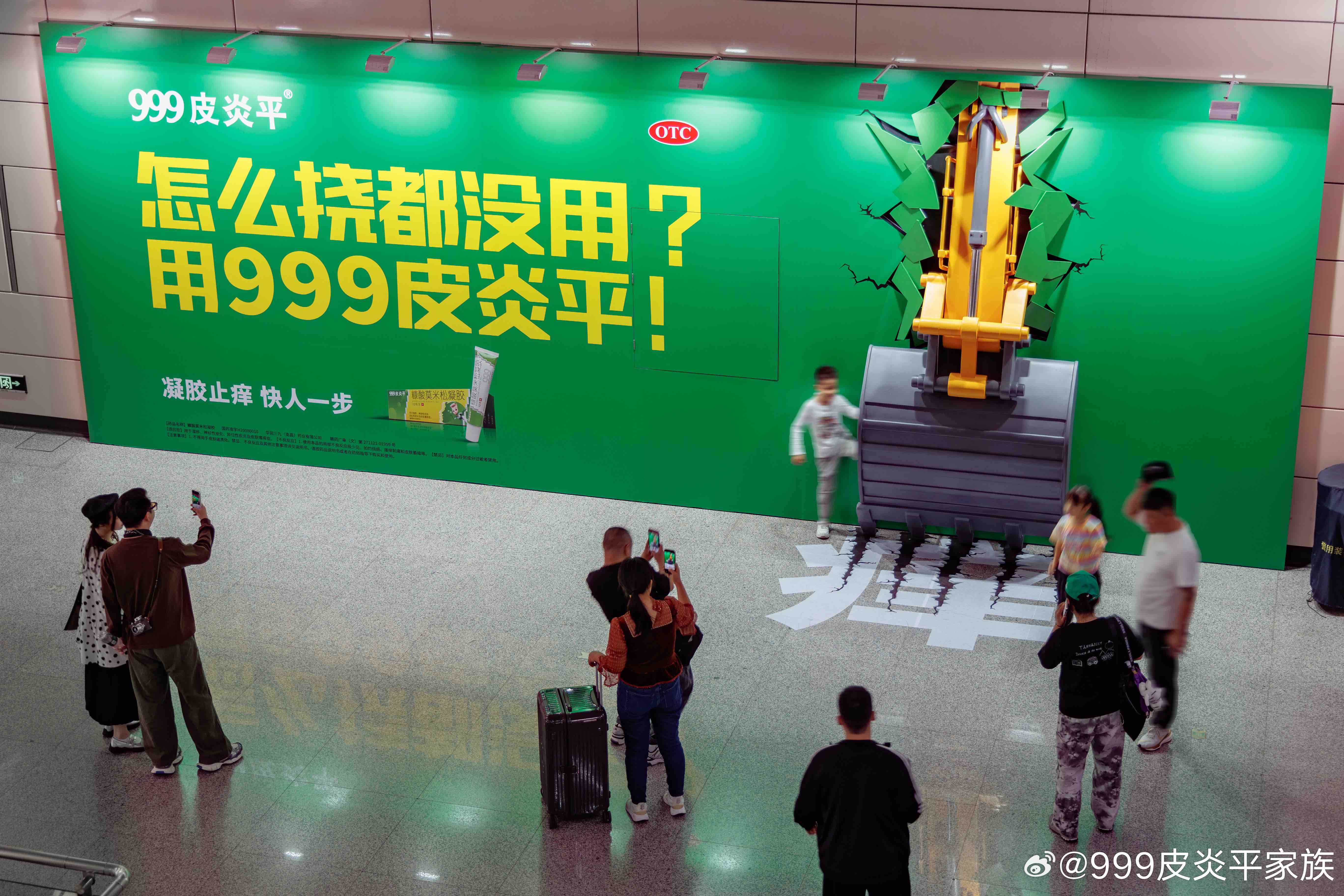 随后,品牌又将挖掘机开进了广州地铁。一觉醒来,广州塔地铁站里一台巨型挖掘机破墙而出,地面上则印有一个被挖掘机挠出抓痕的「痒」字,配合文案「怎么挠都没用?」,将 999 皮炎平「硬核止痒」的卖点再一次具象化。