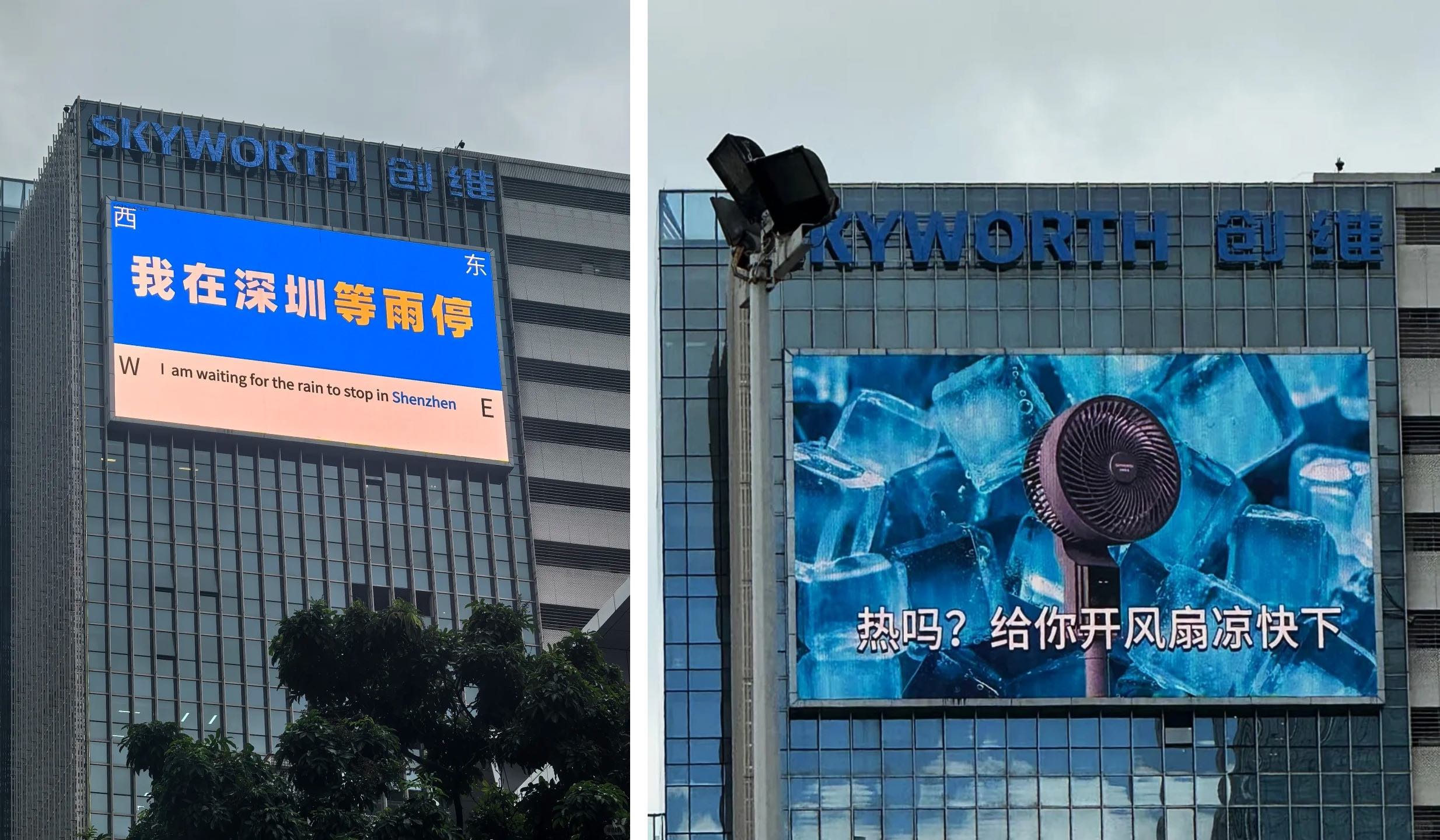 999 感冒灵借大风天气做「风形广告牌」,创维也曾上演同样的创意。去年夏天,深圳大雨频繁,下得让人简直抑郁,创维便利用自家大厦的户外大屏写出了大家的心声「我在深圳等雨停」「啦啦啦 种太阳 种太阳」.....每一句都让人异常有共鸣,创维抓住「讨厌极端天气」的情绪痛点,以嘴替形式替大众发声,有效缓解大家对于糟糕天气的坏情绪。而此前天气炎热时,创维也及时给大家开赛博空调电扇,将品牌媒介转化为城市公共情绪出口。