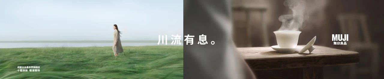 MUJI 成都太古里旗舰店闭店改装升级之际,品牌并以「川流有息」为主题带来了围挡海报,一方面用「川」扣紧四川的在地特色,另一方面以「有息」对应「无息」,点出了 MUJI 正在重装,之后将会以崭新面貌重新与大家见面,既是与成都在地化的联结,又传递出「有息」的品牌生活主张。