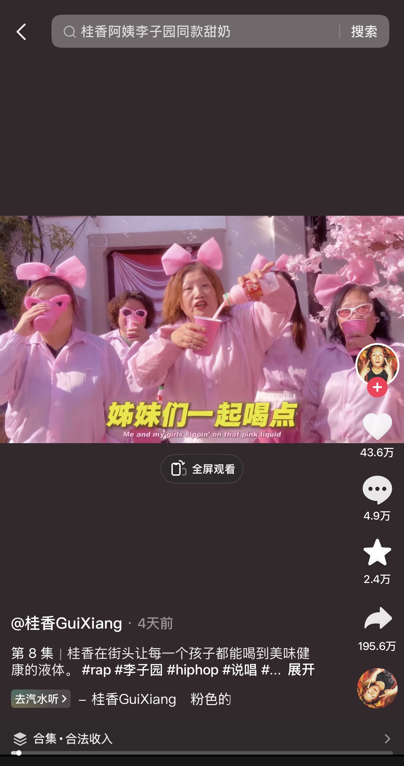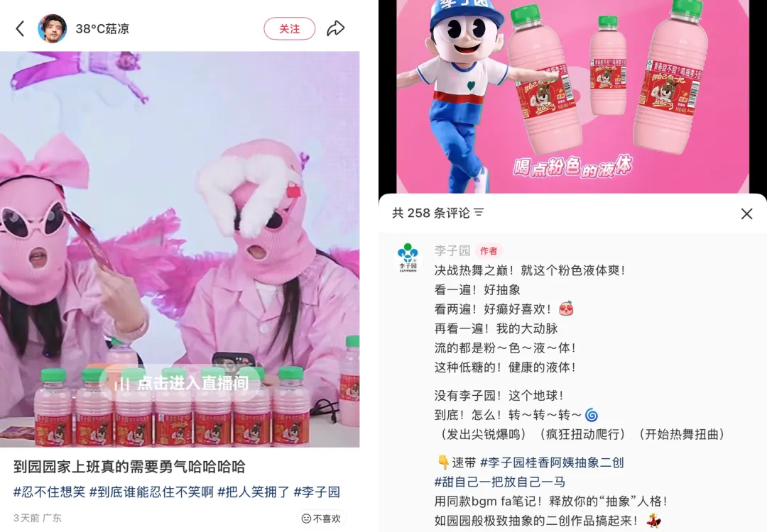 不止于一首震撼首发的 MV,李子园也把这场抽象的「粉色风暴」延续到了运营的各个环节:直播间里,主播纷纷变身「粉色悍匪」,连麦合唱;电商货架上,桂香同款「粉色的液体」火热来袭;甚至自家吉祥物园园也要跟着桂香阿姨的 flow,献上热舞,誓要决战抽象之「颠」......