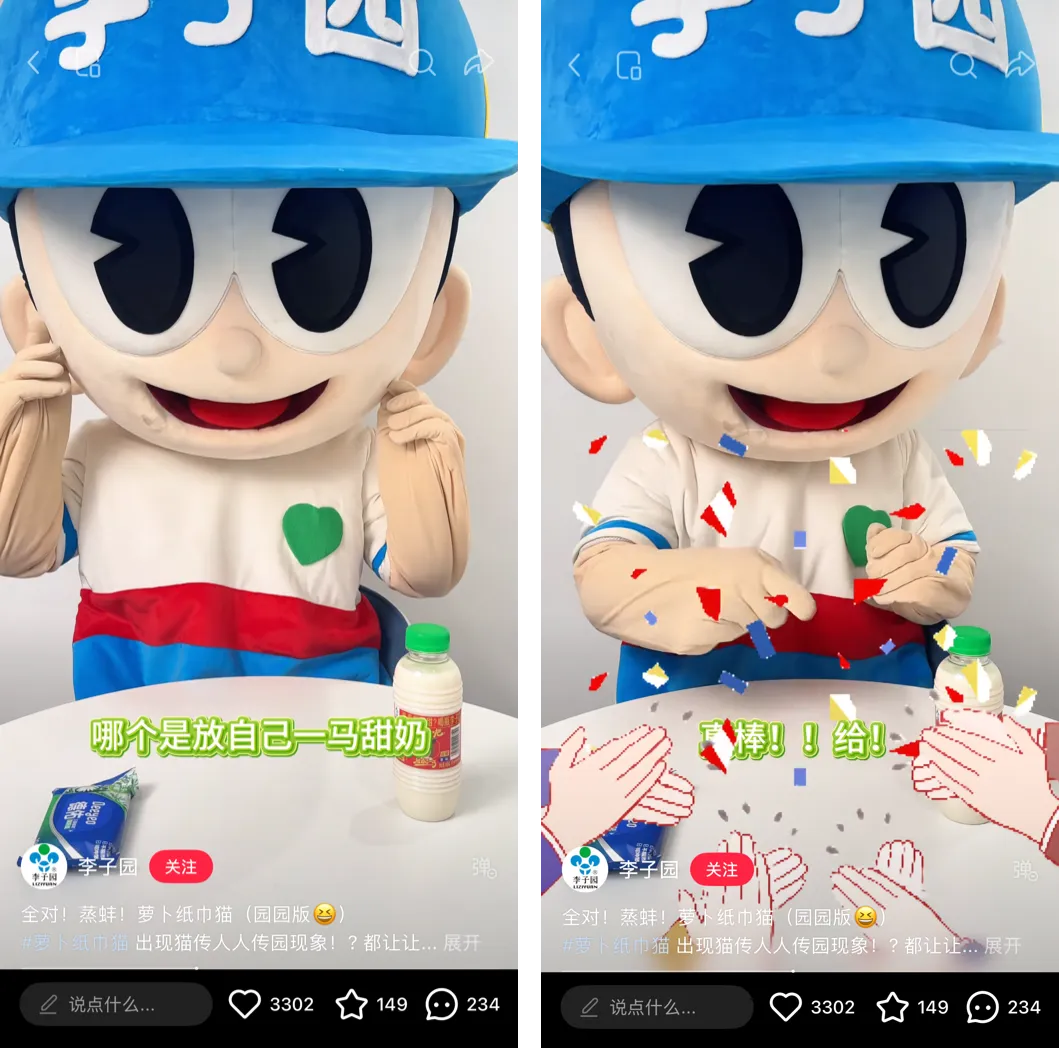 近期刷屏的萝卜纸巾猫传人现象,就第一时间传到了园园身上。除了常规的纸巾之外,李子园特别在选项中放进了自家产品「放自己一马」甜奶和品牌代言人成毅的周边,园园也不负大家所望,靠着过硬的实力完成挑战,得到了一句句「蒸蚌」。