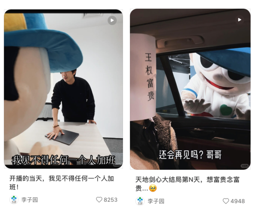 不仅如此,李子园的追星活跃程度堪比「粉头」。打开李子园官号,日常不是在库库上架哥哥新周边,就是在为哥哥的新剧做宣发,cos 名场面、云包场……就连品牌发布的 2025 年度报告,也必须「含毅量」100%。