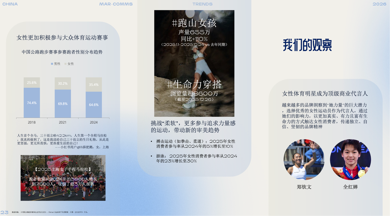 • 她主场:女性将从大众体育赛事的参与者,日益转变为重要的定义者与推动者。对于运动时尚品牌而言,更需要从女性视角出发,产品设计方面满足运动女性被忽视的需求,同时利用专属社群长期建立连接,打造具有品牌归属感的「能量场」。