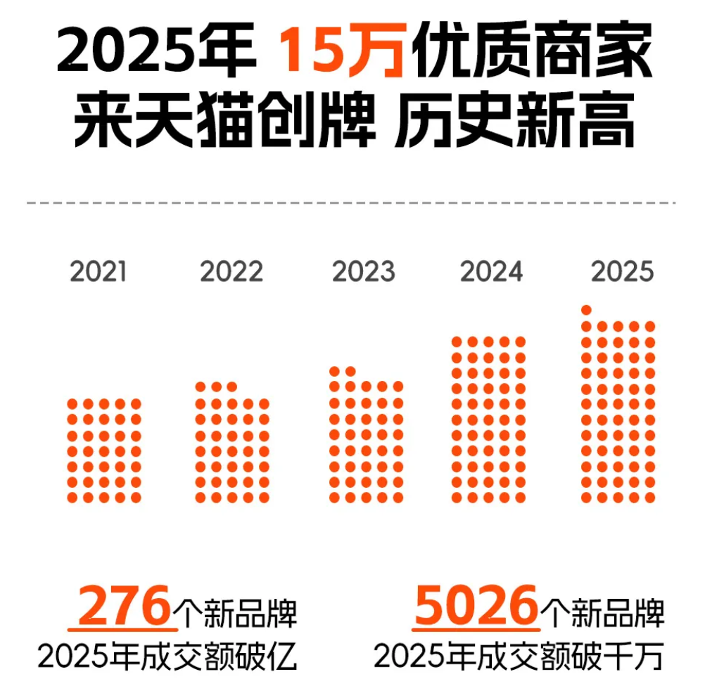 天猫发布《2025 年度新品牌发展报告》。报告显示,有 15 万优质商家于 2025 年在天猫创牌,规模创历史新高。